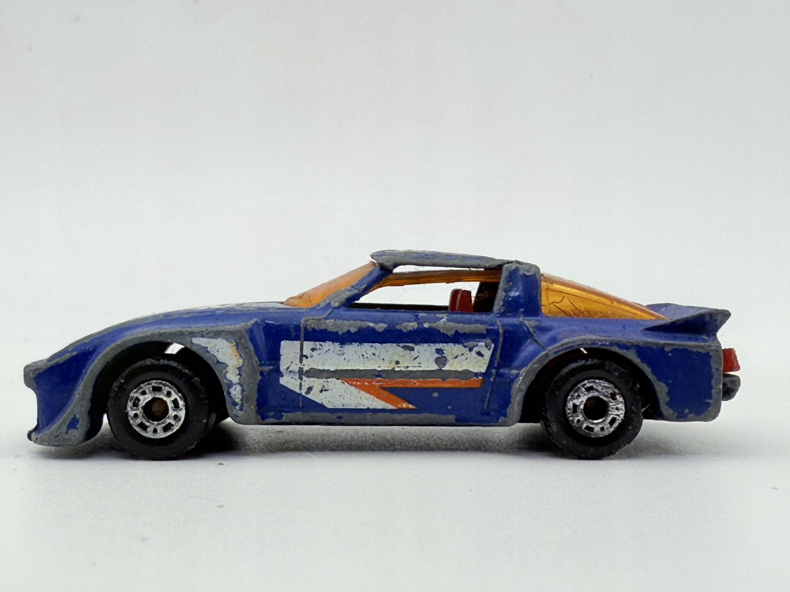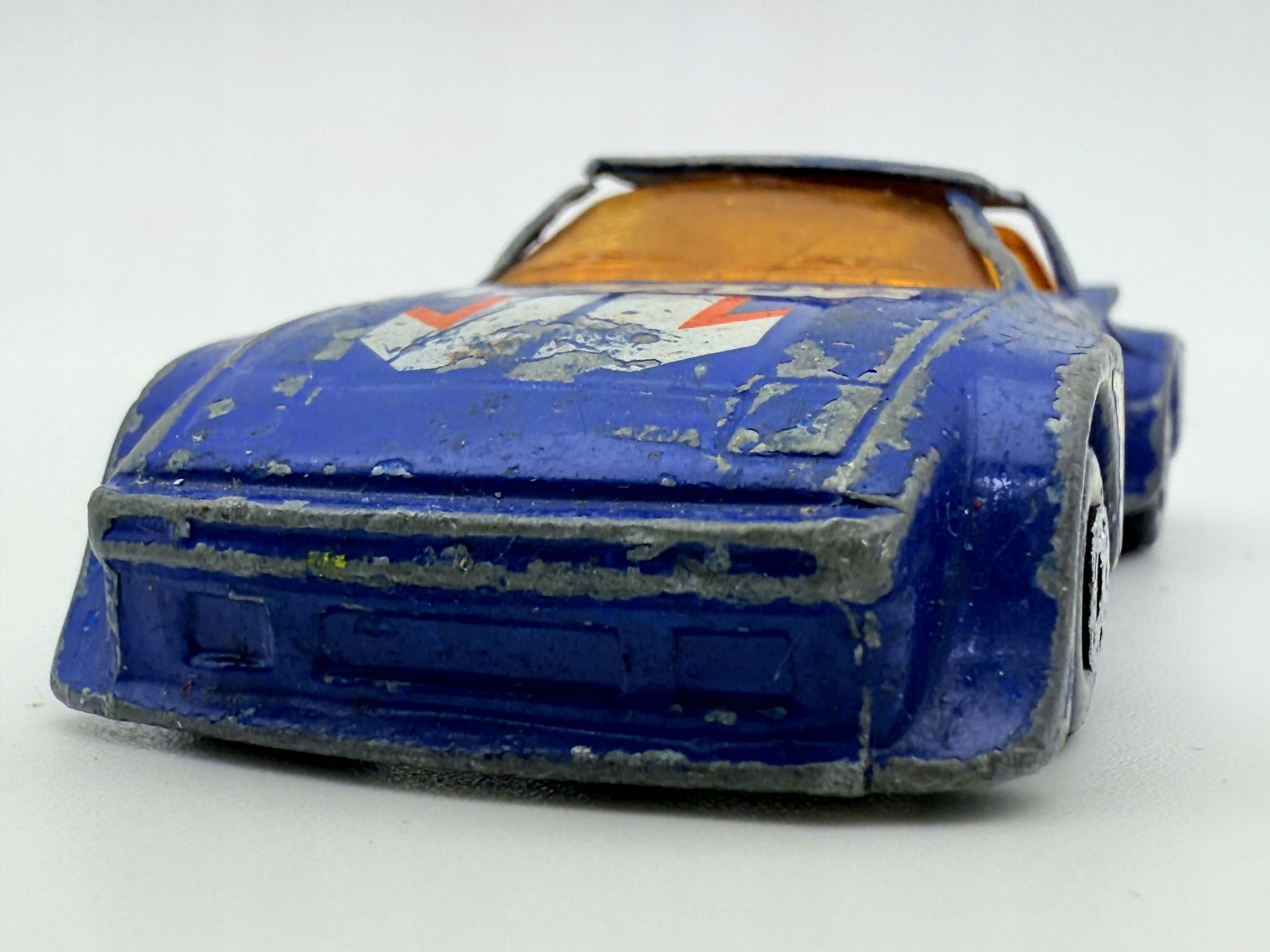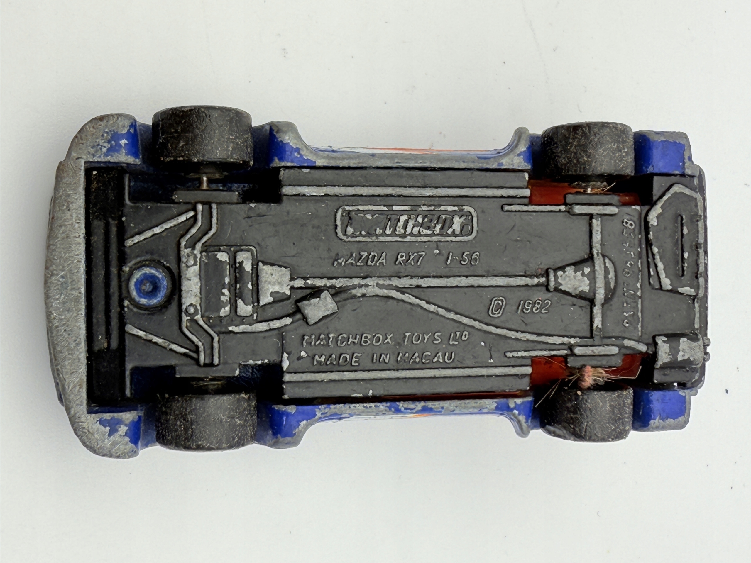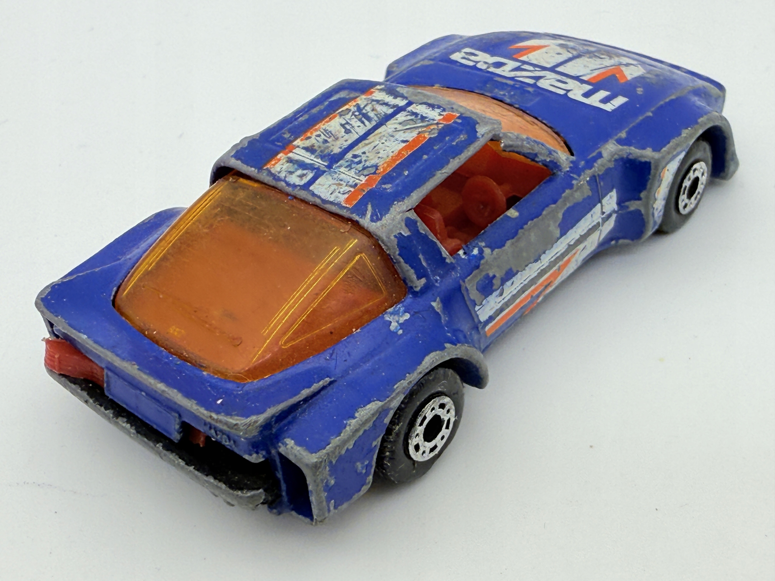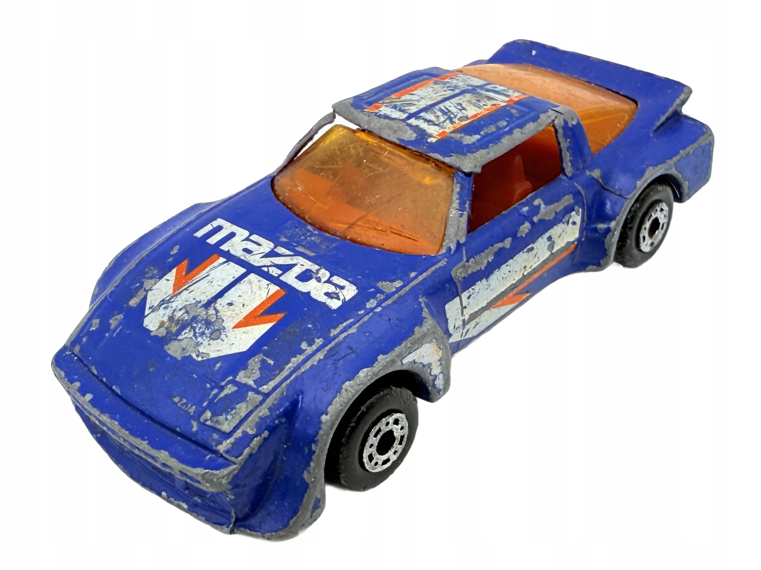 Пружинная подвеска Mazda RX7 от Matchbox отличается синим цветом с оранжево-белыми деталями и характерными оранжевыми окнами.