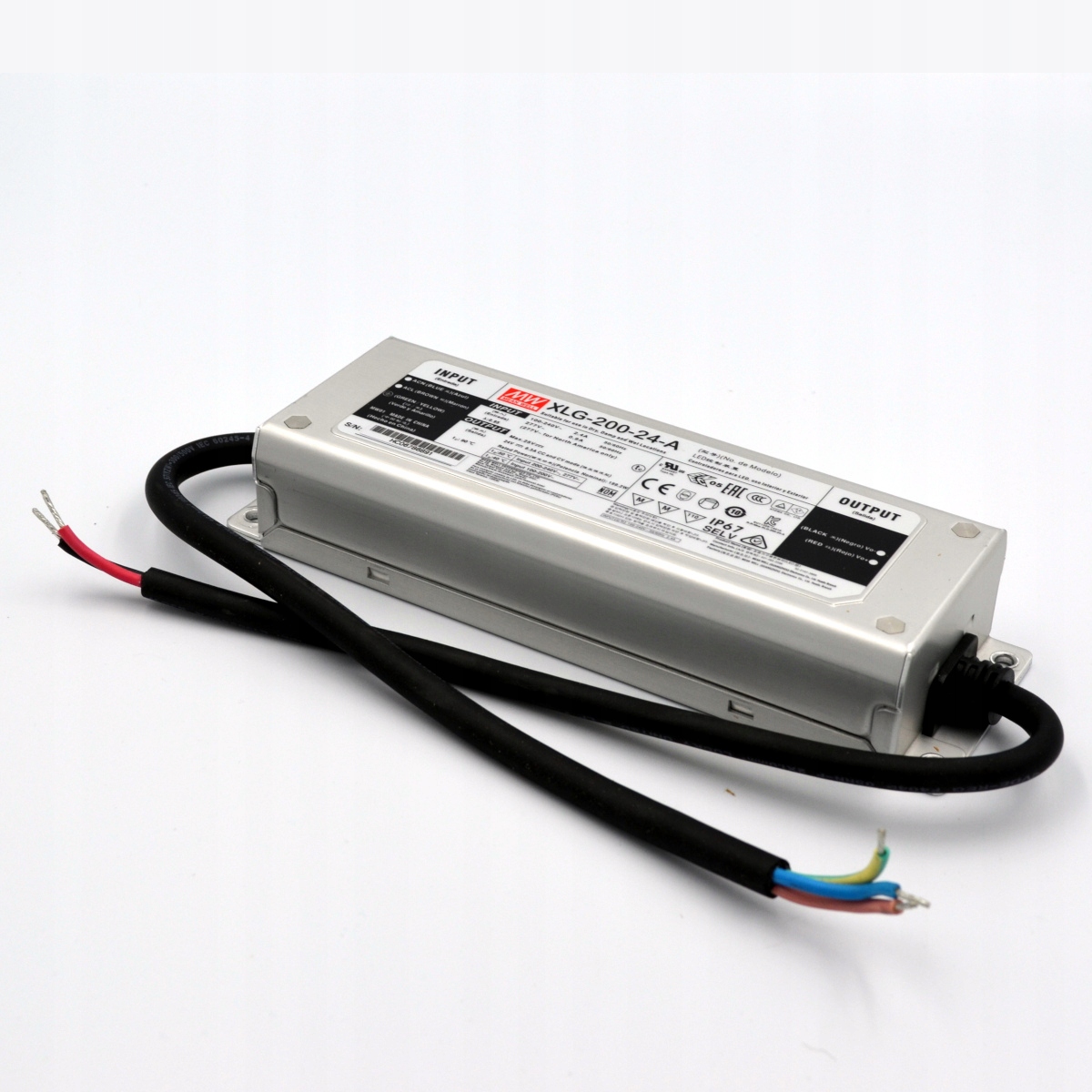 Профессиональный источник питания постоянной мощности Mean Well XLG-200-24-A 24V DC, предназначенный для светодиодного освещения, в металлическом корпусе, класс герметичности IP 67, с активным фильтром PFC, номинальной мощностью 200 Вт.