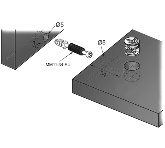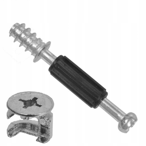 Комплект состоит из штифта, вкручиваемого с помощью отвертки, и эксцентрика, используемого для затяжки соединения.