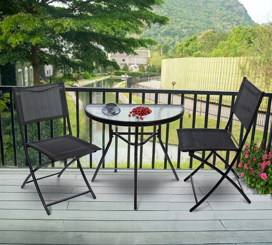 Современный и элегантный дизайн комплекта металлической мебели из трех предметов, который будет хорошо смотреться на небольшом балконе или террасе. В комплект входят два удобных стула со спинками и стол со столешницей из закаленного стекла. Плюсом комплекта является возможность складывания стульев, а небольшие габариты облегчают хранение мебели вне сезона. Каркас имеет двойное порошковое покрытие, что идеально подходит для использования внутри и снаружи. Сиденье и спинка стула имеют черную гибкую текстильную обивку для максимального комфорта. Используемые материалы не требуют ухода, устойчивы к погодным условиям и не требуют специальных средств по уходу.