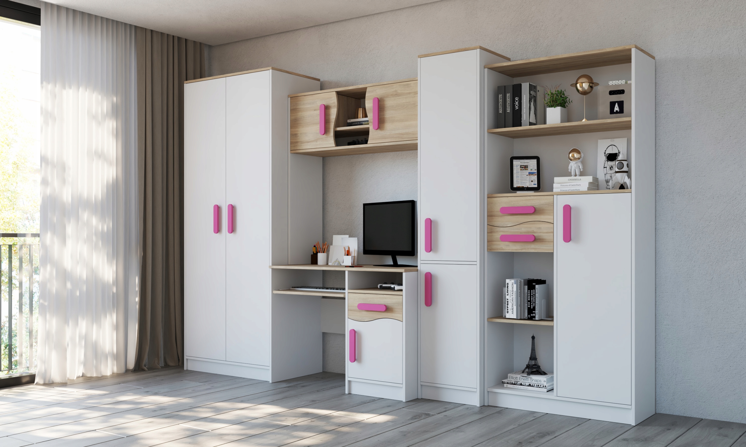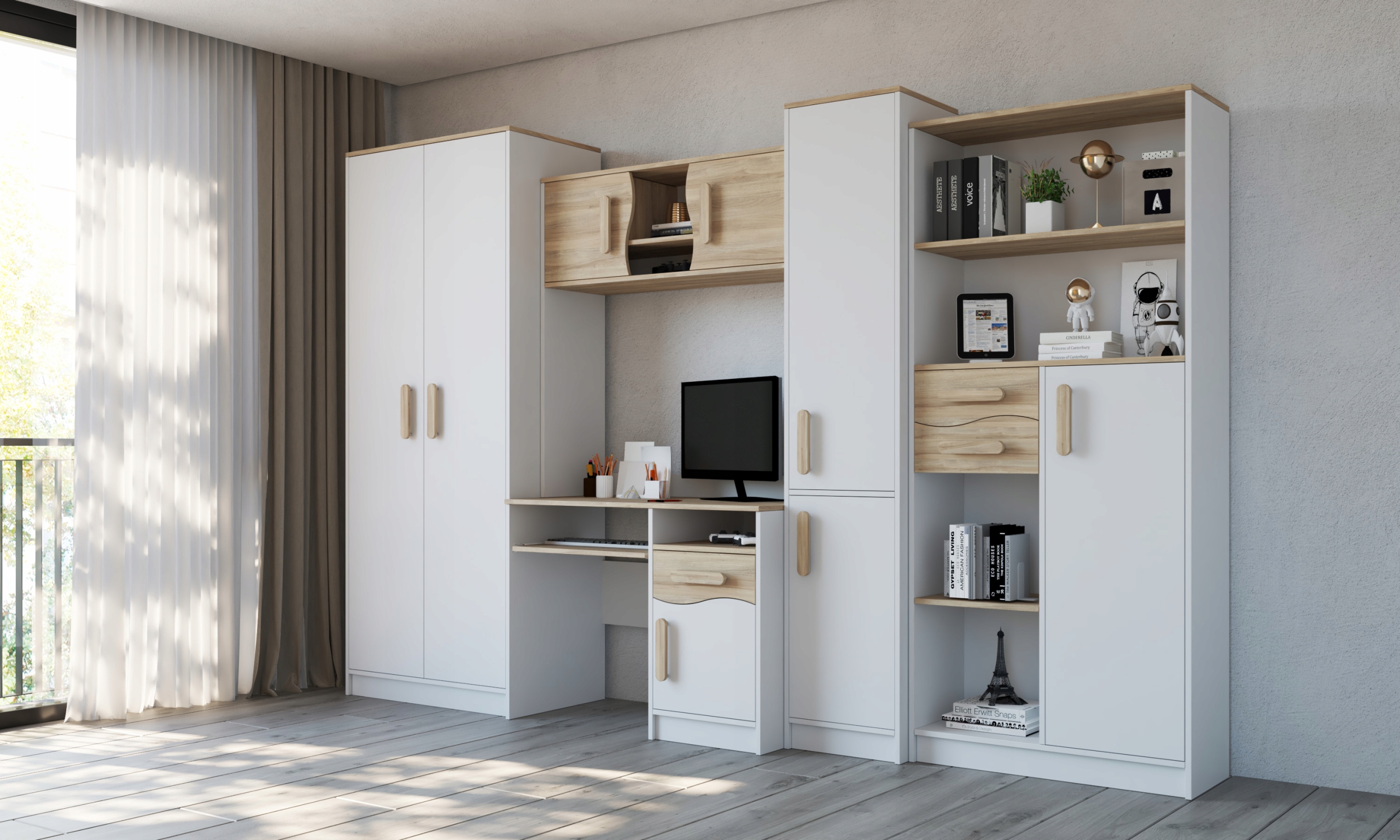 Современный, функциональный и просторный комплект, который найдет свое место как в подростковой или детской комнате, так и в гостиной и станет идеальным местом для обучения или игр.
