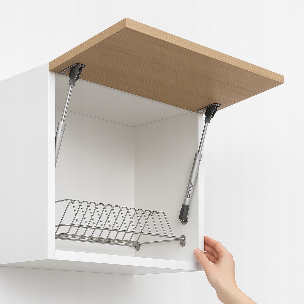Газовый мебельный подъемник GTV 150N — идеальное решение для легких дверей и распашных люков. Он хорошо подойдет для кухни, ванной, офиса и даже детской мебели. Благодаря приводу меньшей мощности 150Н передняя часть открывается плавно, без рывков и устойчиво останавливается в верхнем положении.