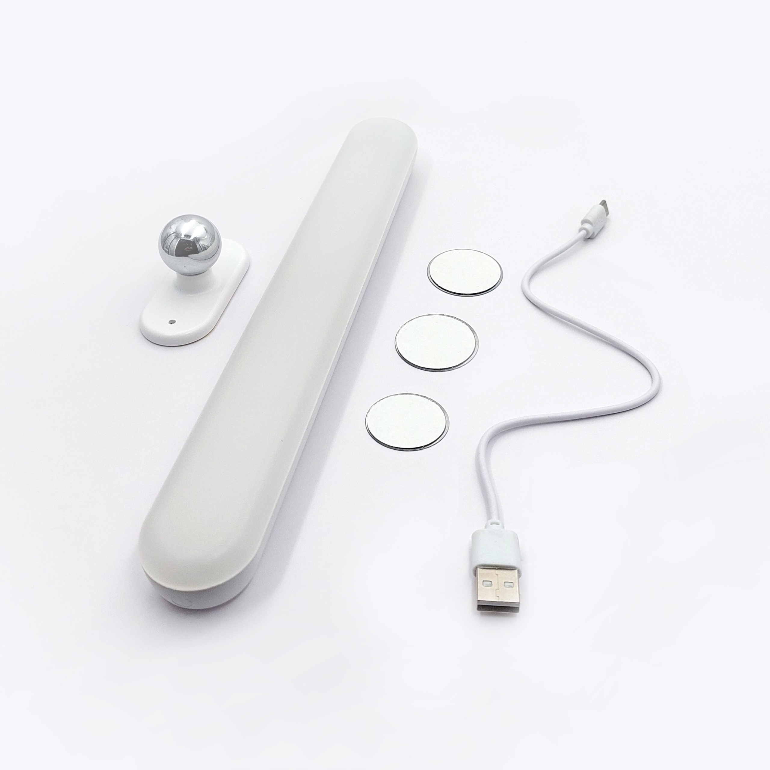 В комплект входят: кабель USB-C (около 25 см), самоклеющееся магнитное крепление и основание с шариком,