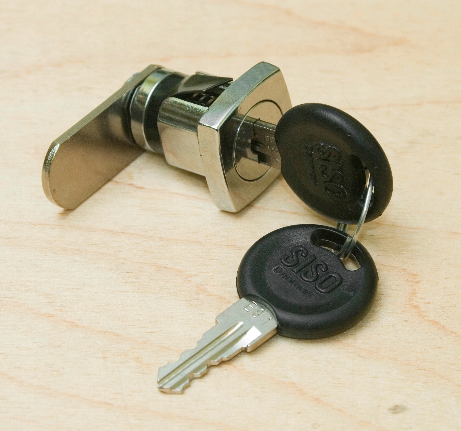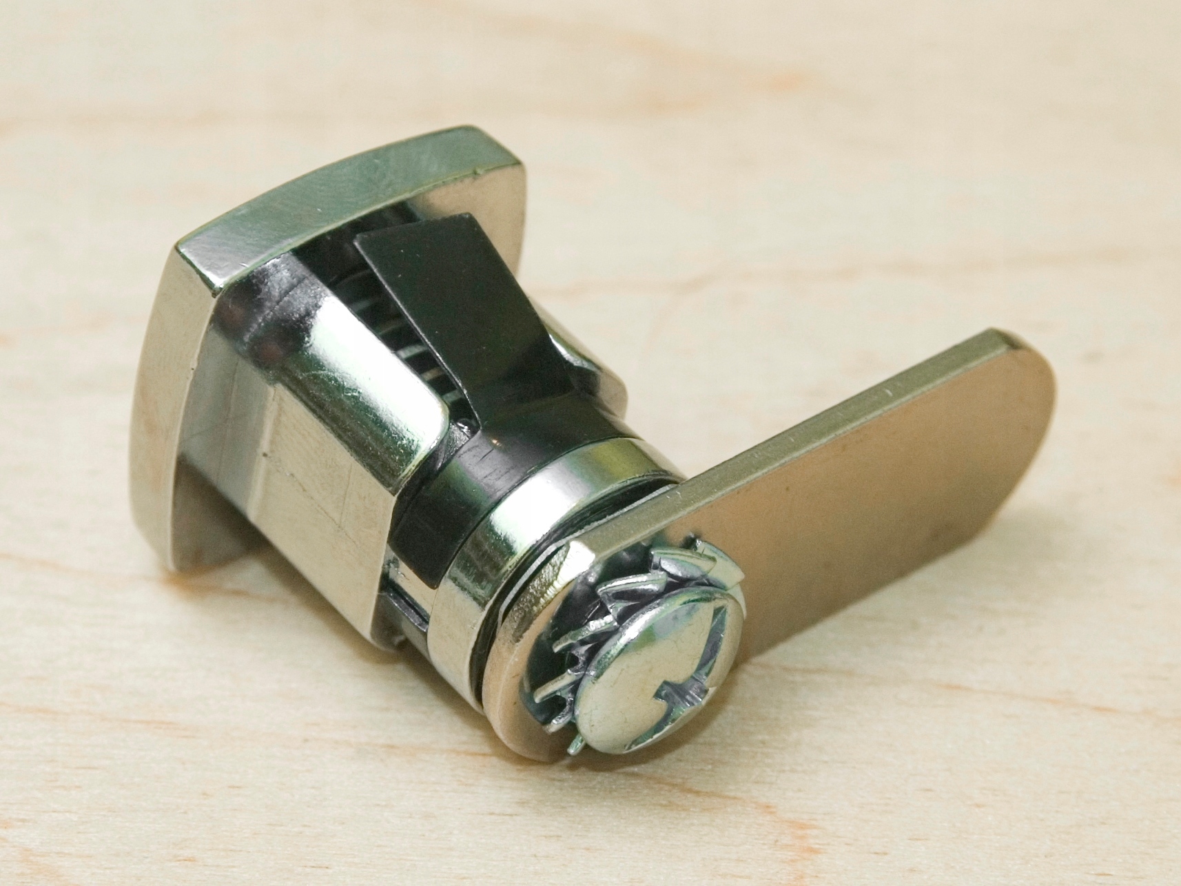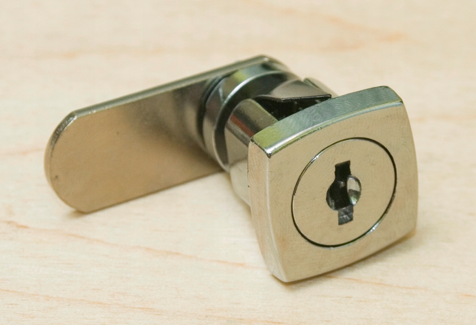 Описание: качественный замок из металла цвета хром. Видимая со стороны ключа лицевая сторона замка имеет квадратную форму со слегка выпуклыми сторонами. Закрывающим элементом является металлическая вкладка. При повороте ключа язычок поворачивается на 180 градусов. Замок устанавливается путем впрессовки его в монтажное отверстие. Для листового металла толщиной не более 2 мм. Язычок установлен на штифте квадратной формы и прикреплен к корпусу замка винтом. Замок имеет 400 комбинаций клавиш.