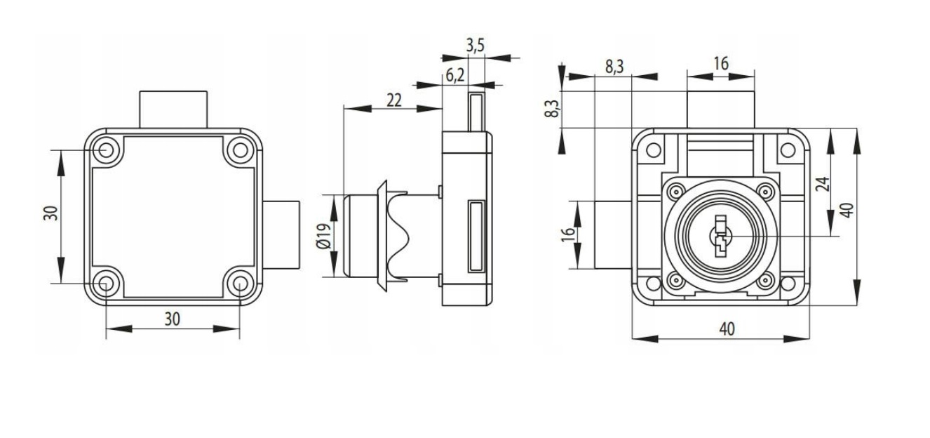 Мебельный замок квадратный левый fi19x22 с двойным ригелем.