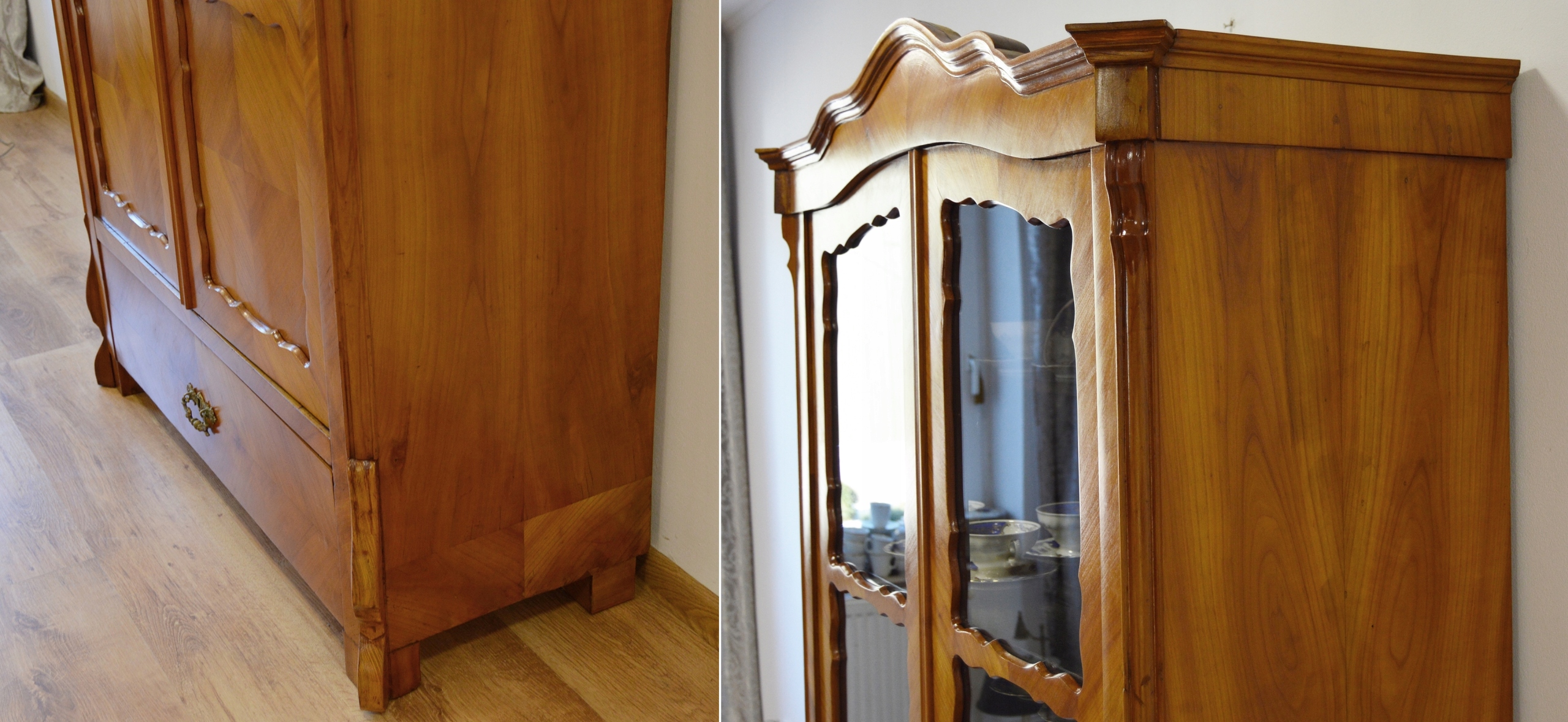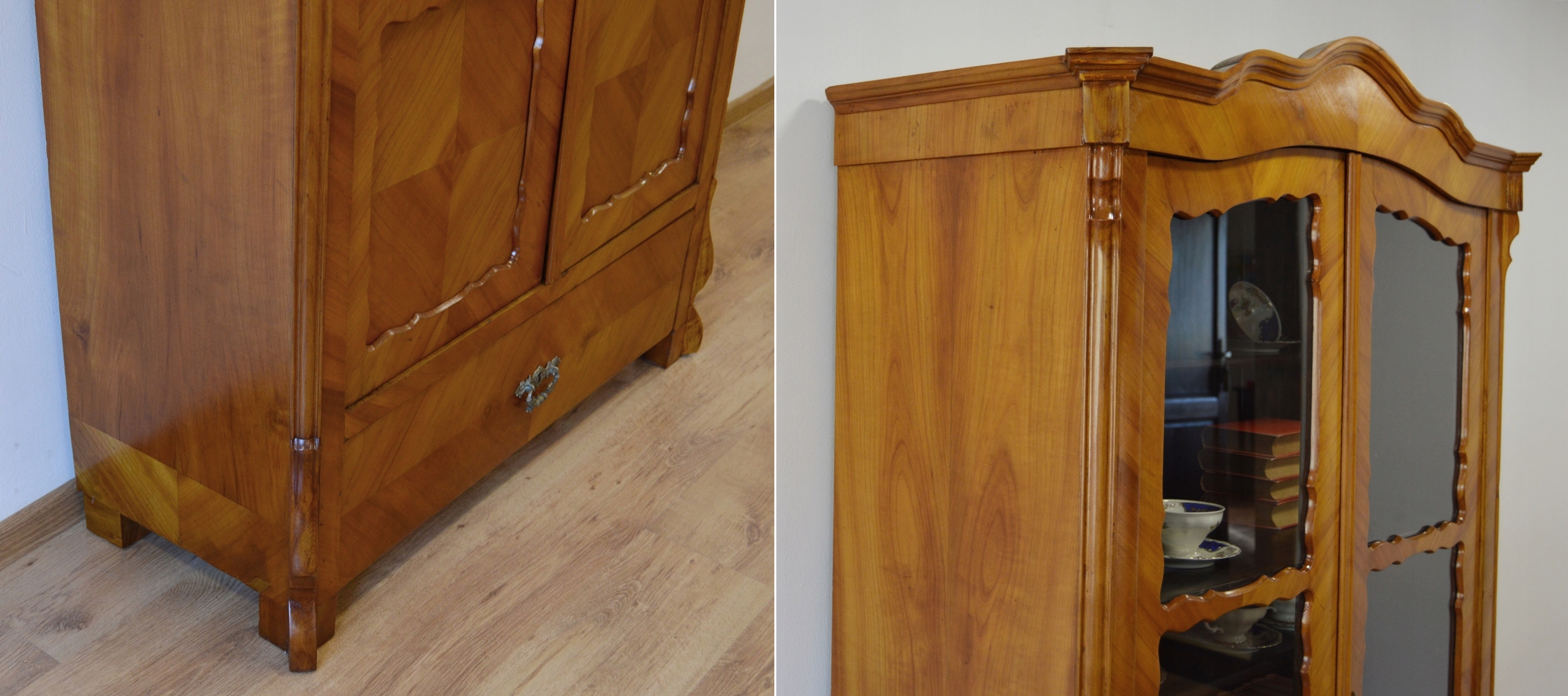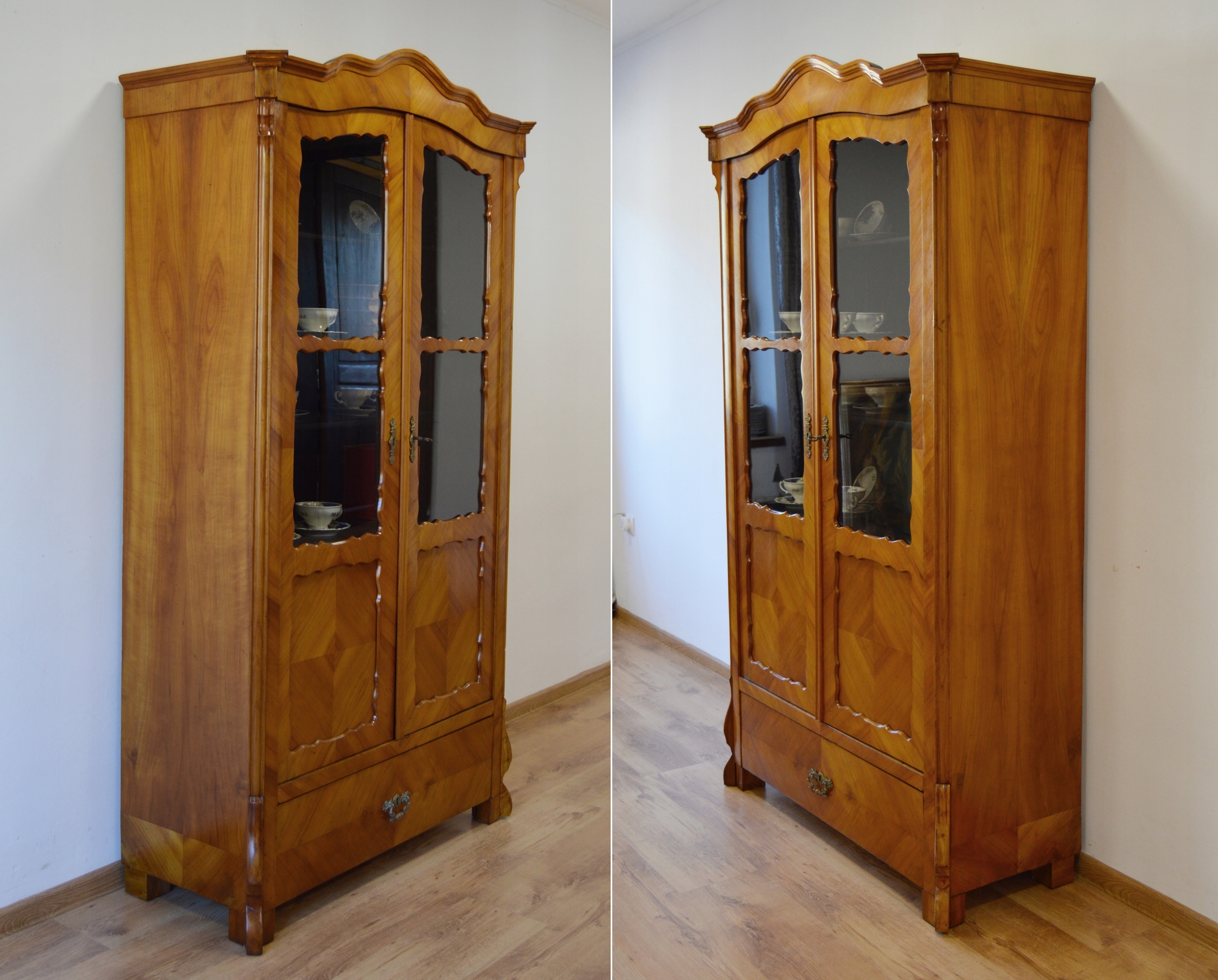 В очень хорошем состоянии. Мебель готова к использованию. Обновлены внешние поверхности и интерьер мебели. Мебель уже старая и следы прошлого, не влияющие на ее эстетическое восприятие, являются доказательством подлинности мебели. Витрину можно сразу разместить в квартире.