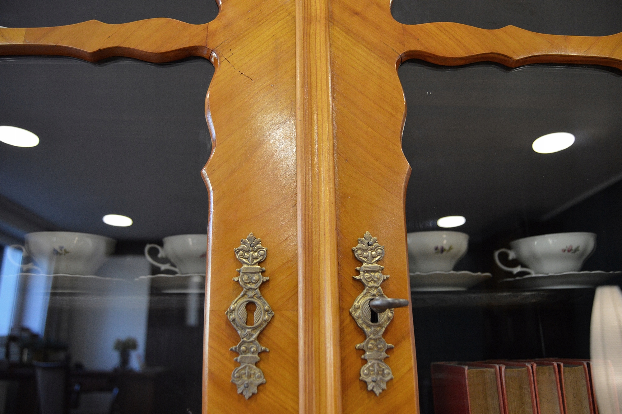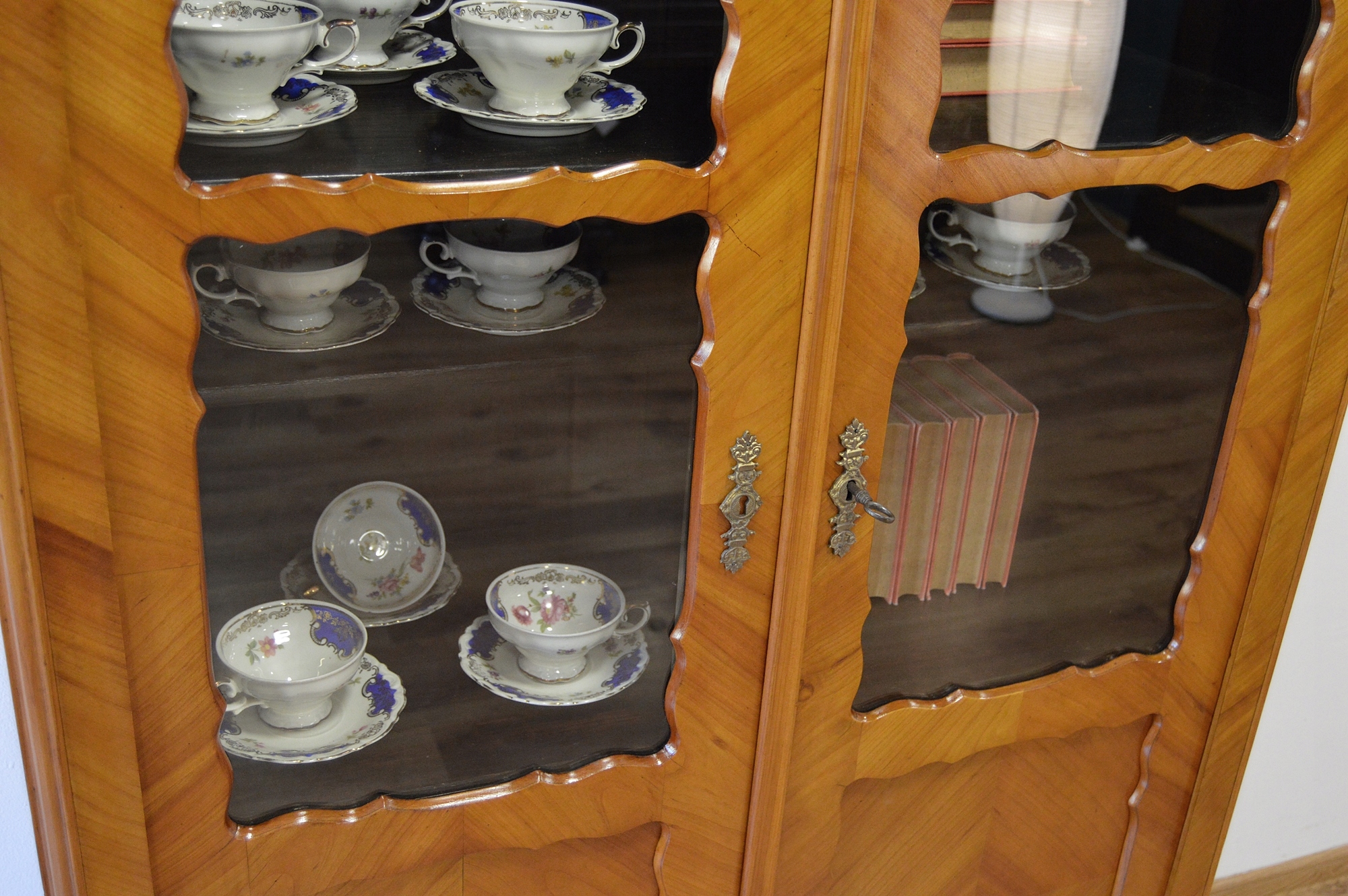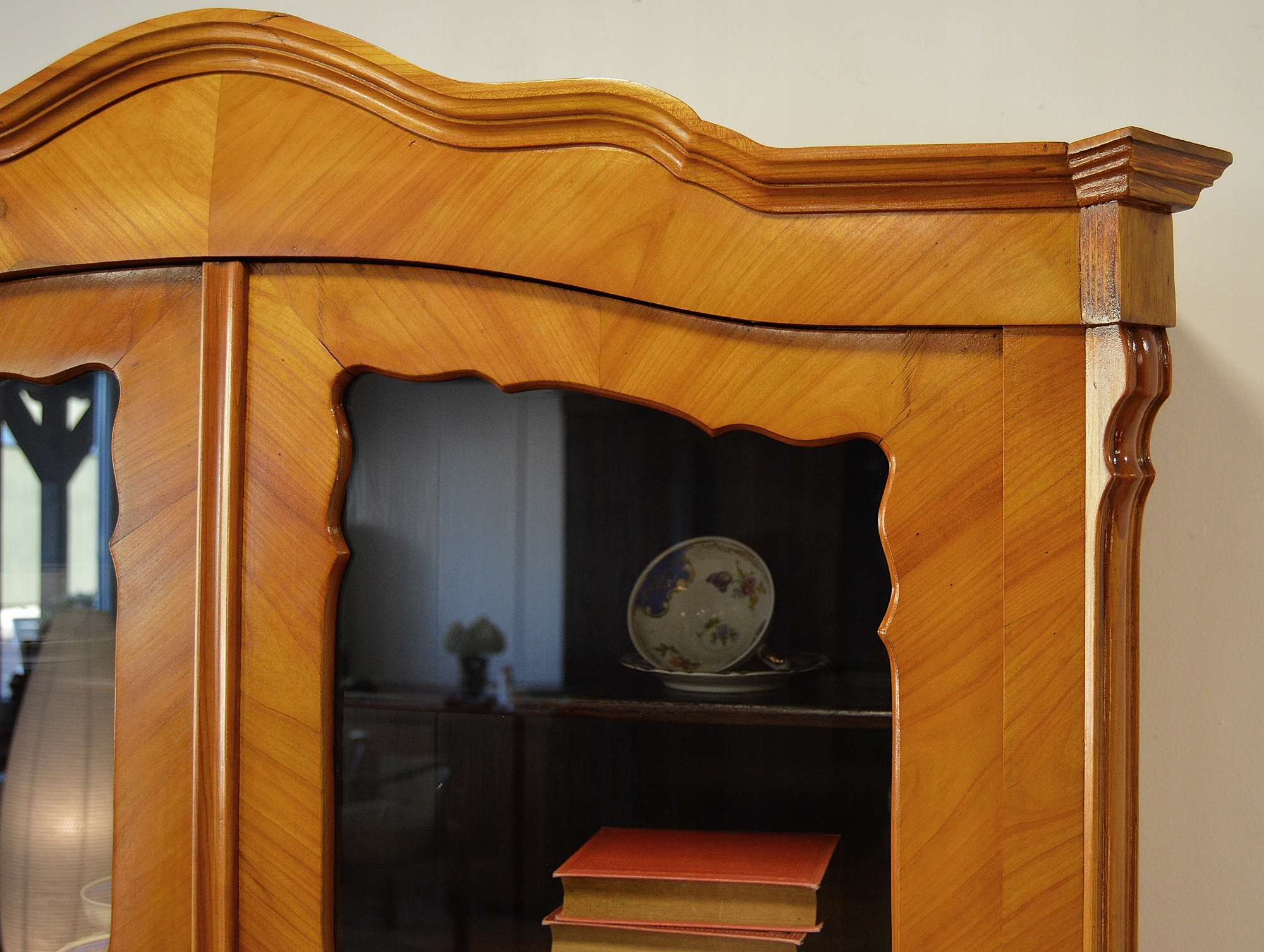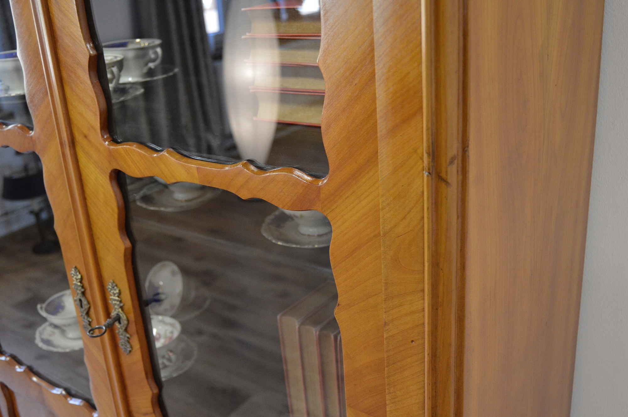В очень хорошем состоянии. Мебель готова к использованию. Обновлены внешние поверхности и интерьер мебели. Мебель уже старая и следы прошлого, не влияющие на ее эстетическое восприятие, являются доказательством подлинности мебели. Витрину можно сразу разместить в квартире.