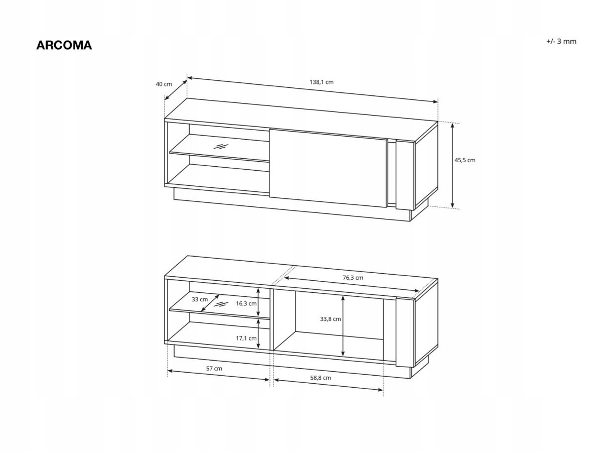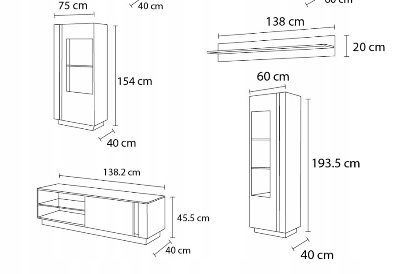 - ТВ СТОЛ 138 – ширина 138,5 см, высота 45,5 см, глубина 40 см.