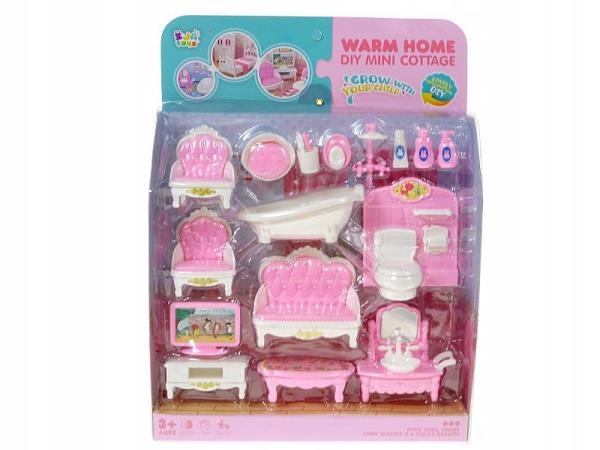 Набор мебели для обустройства кукольного домика. Красиво выполнено в элегантном стиле и девичьих, нежных тонах. Они наверняка порадуют каждого маленького декоратора интерьера.