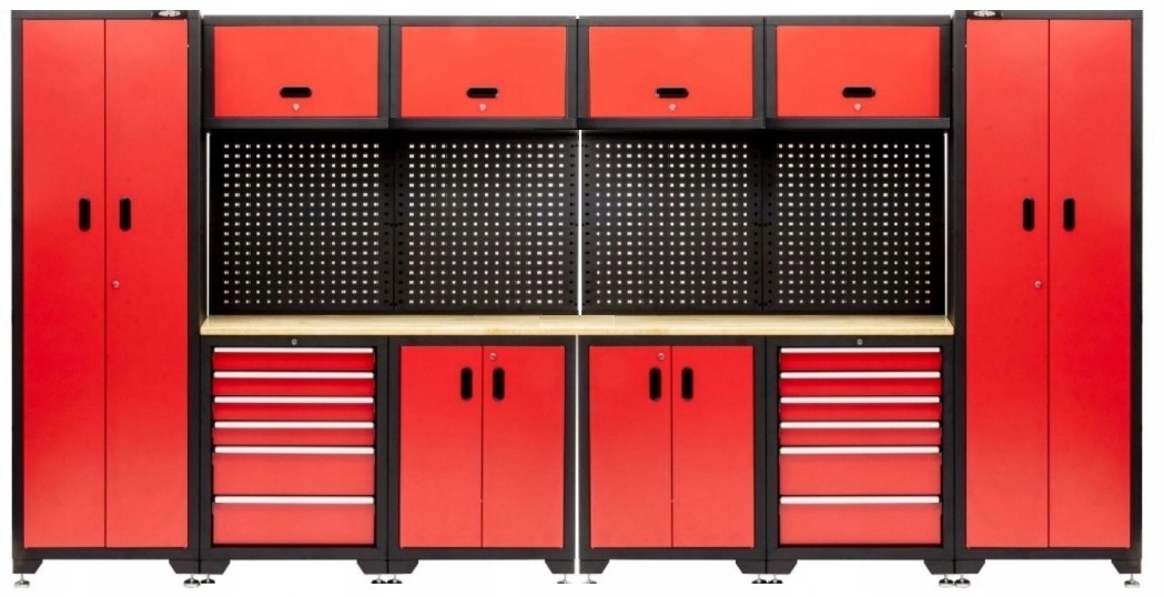 Нижний шкаф имеет 6 ящиков. Общий размер шкафа составляет 65 х 43 х 80 см. 4 ящика меньшего размера и имеют размеры 54 х 38 х 8 см. Два больших ящика имеют размеры 54 х 38 х 16,5 см. Ящики имеют центральный замок, поэтому в них можно безопасно хранить инструменты.