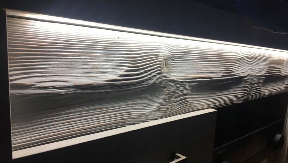 Ребристость означает получение неровной структуры на поверхности древесины. Эта технология предполагает вырезание или фрезерование зазоров и царапин размером 2 – 3 мм. Рифленая доска – чрезвычайно привлекательный элемент, тонко интегрированный в фасады мебели.