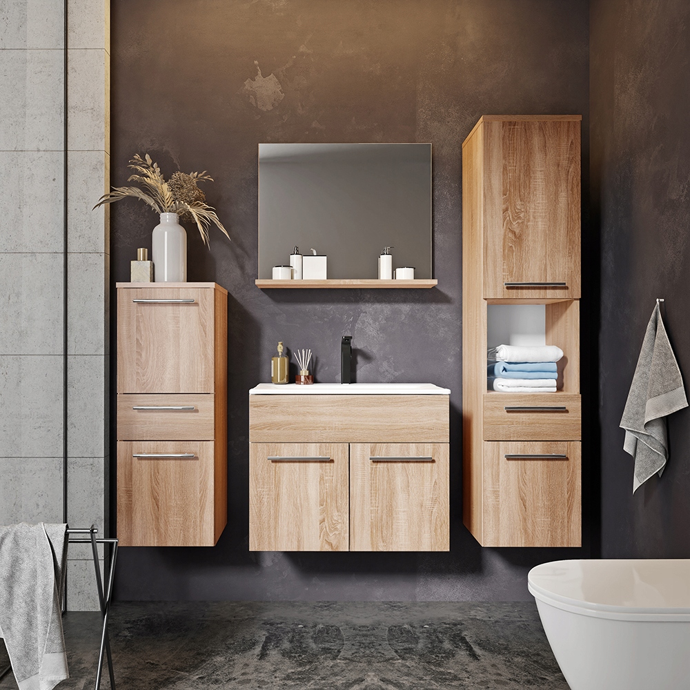 Современный комплект мебели для ванной комнаты, белый глянец + дуб сонома. Набор разработан с учетом пользователя и его комфорта. Он изготовлен из высококачественных материалов с использованием новейших механизмов. Комплект из 4-х элементов.