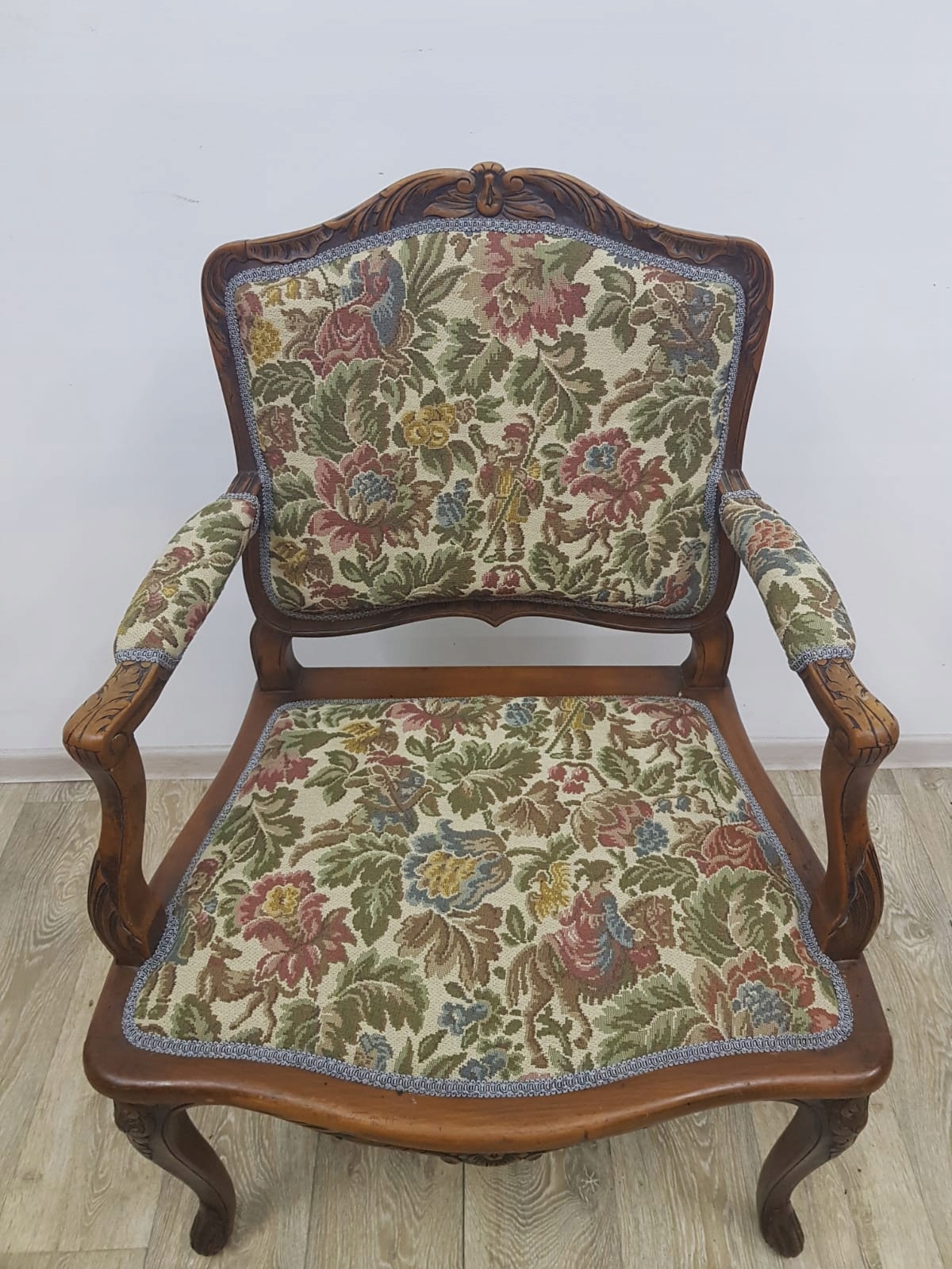 Величественное резное кресло в стиле Чиппендейл с богато украшенной гобеленовой обивкой.