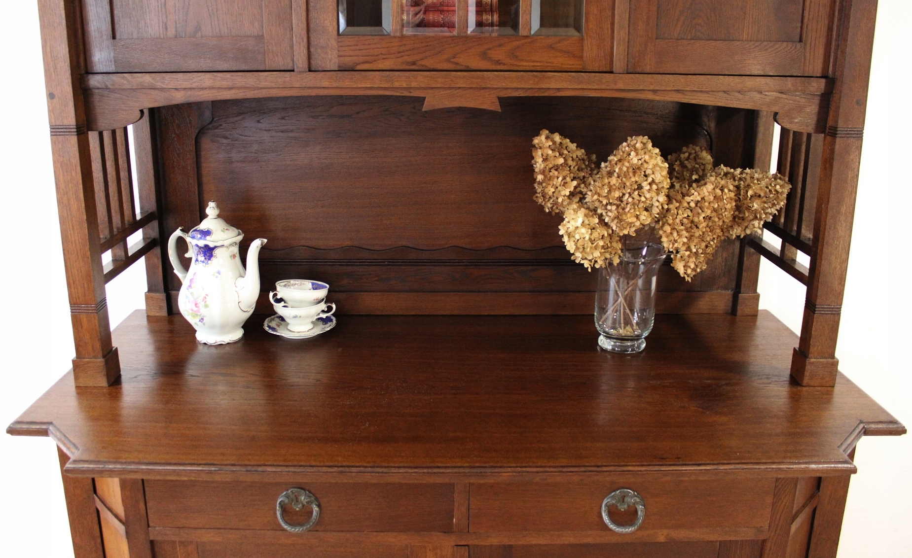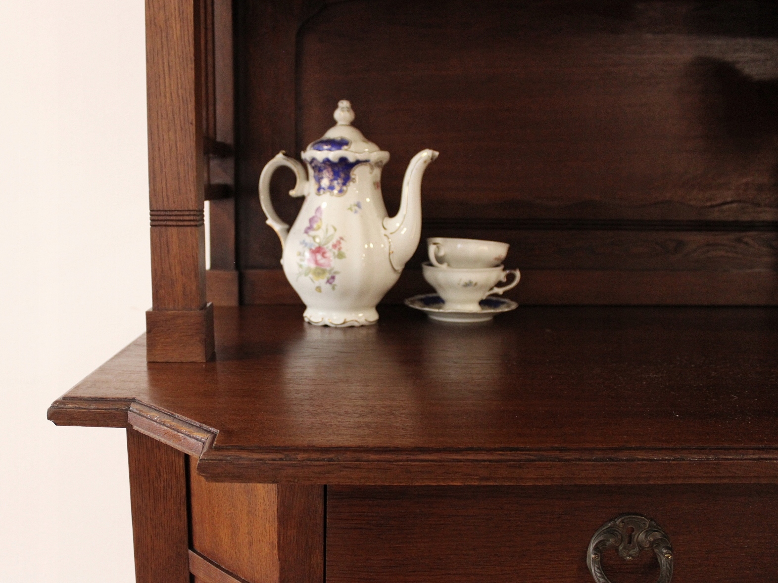 Высокий буфет теплого цвета. Красивое скошенное стекло. Высокое место на столешнице, где можно разместить, например, кофемашину :)