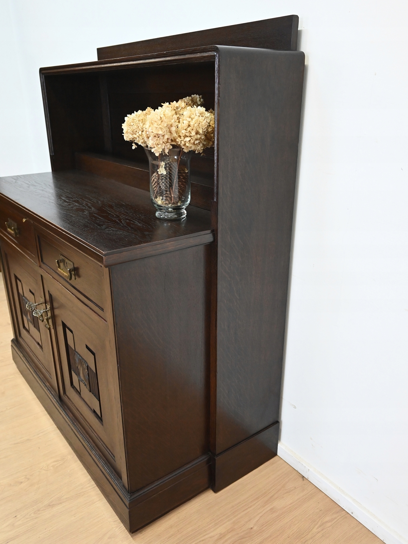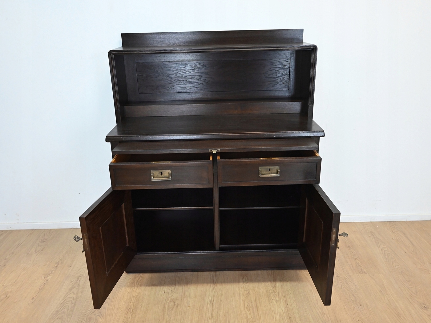 Он полностью изготовлен из дерева, покрыт шпоном дуба.