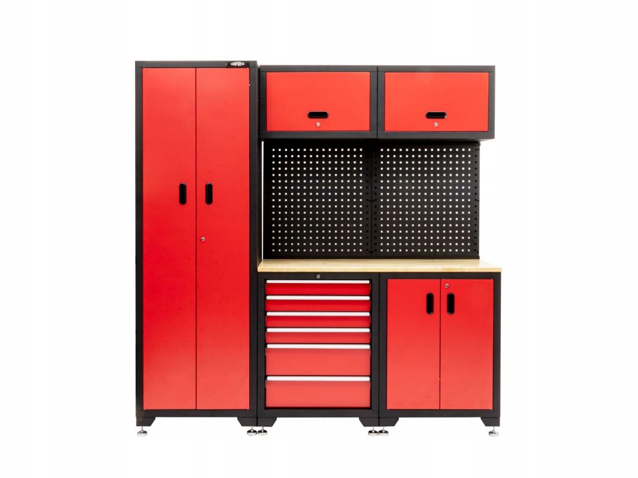 С этим модульным комплектом оборудования для мастерской у вас будет полная мебель для мастерской. В комплект входит большой боковой шкаф с открывающимися дверцами, нижний шкаф с шестью ящиками, например, для инструментов, два верхних шкафа, небольшой шкаф и задняя стенка, на которую можно дополнительно повесить любые инструменты на крючках. Модульный шкаф имеет размеры 198,3 х 51 х 192,5 см. Для защиты столешница из березы покрыта льняным лаком и имеет размеры 132 х 44. В набор дополнительно входят 217 инструментов AIRPRESS из твердой пены ЭВА, которые идеально помещаются в ящики одного из шкафов.