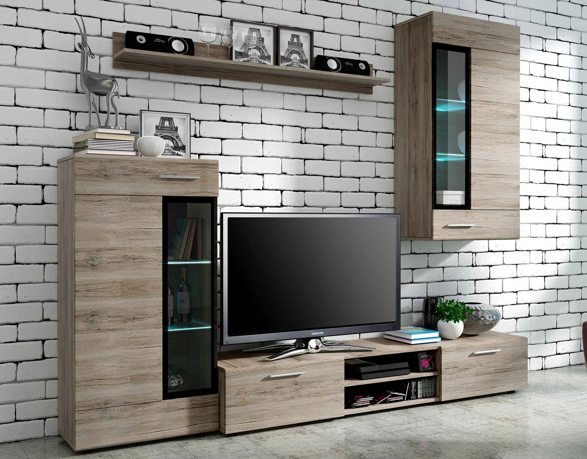 Это одновременно элегантный и функциональный настенный блок. Он доступен в нескольких цветовых вариантах, таких как: дуб сонома, темный сан-ремо, дуб сонома/белый, ремесленный дуб/белый. В состав стенки входят два современных шкафа-купе с витриной, в том числе один подвесной с возможностью установки светодиодного освещения. Благодаря фасаду со стеклом и стеклянным полкам со светодиодной подсветкой вы сможете продемонстрировать перед гостями то, что для вас наиболее важно.