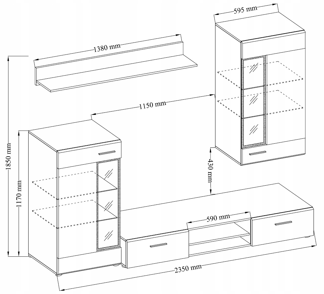 В комплект входят два вместительных шкафа со стеклом спереди, которые осовременят любой интерьер. Один из них представляет собой классический шкаф-купе с витриной, а другой крепится прямо на стену над тумбой под телевизор. Витрины имеют три полки с распашными дверцами. Элегантное остекление с тонированными краями и одна полка придают всему современный вид.