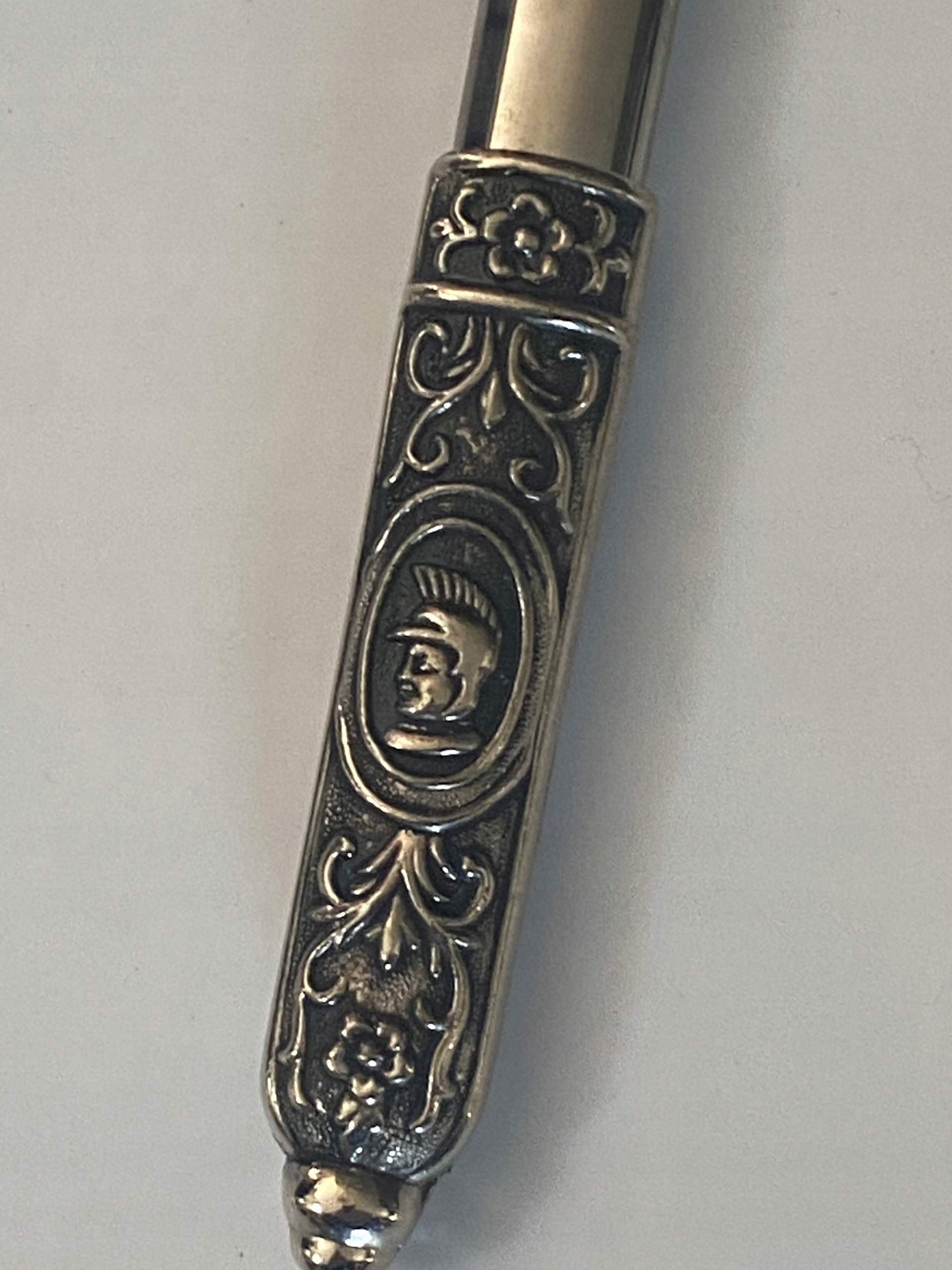 Украшения на рукояти и ножнах изготовлены из металлического литья. Рукоять украшена серебряной цепочкой и барельефами.