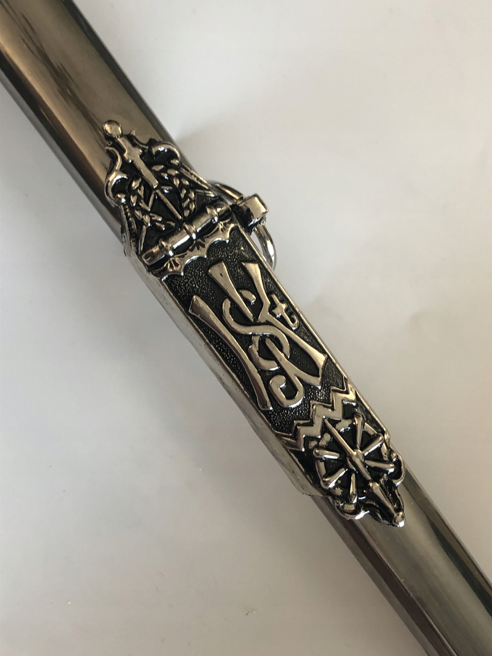 Клинок украшен надписями и орнаментом. Ножны украшены тремя металлическими барельефами серебристого, черного и красного цветов. Украшение в виде барельефа с мотивом дракона Мальтийского креста. Все это выглядит оригинально и готово украсить ваш офис.