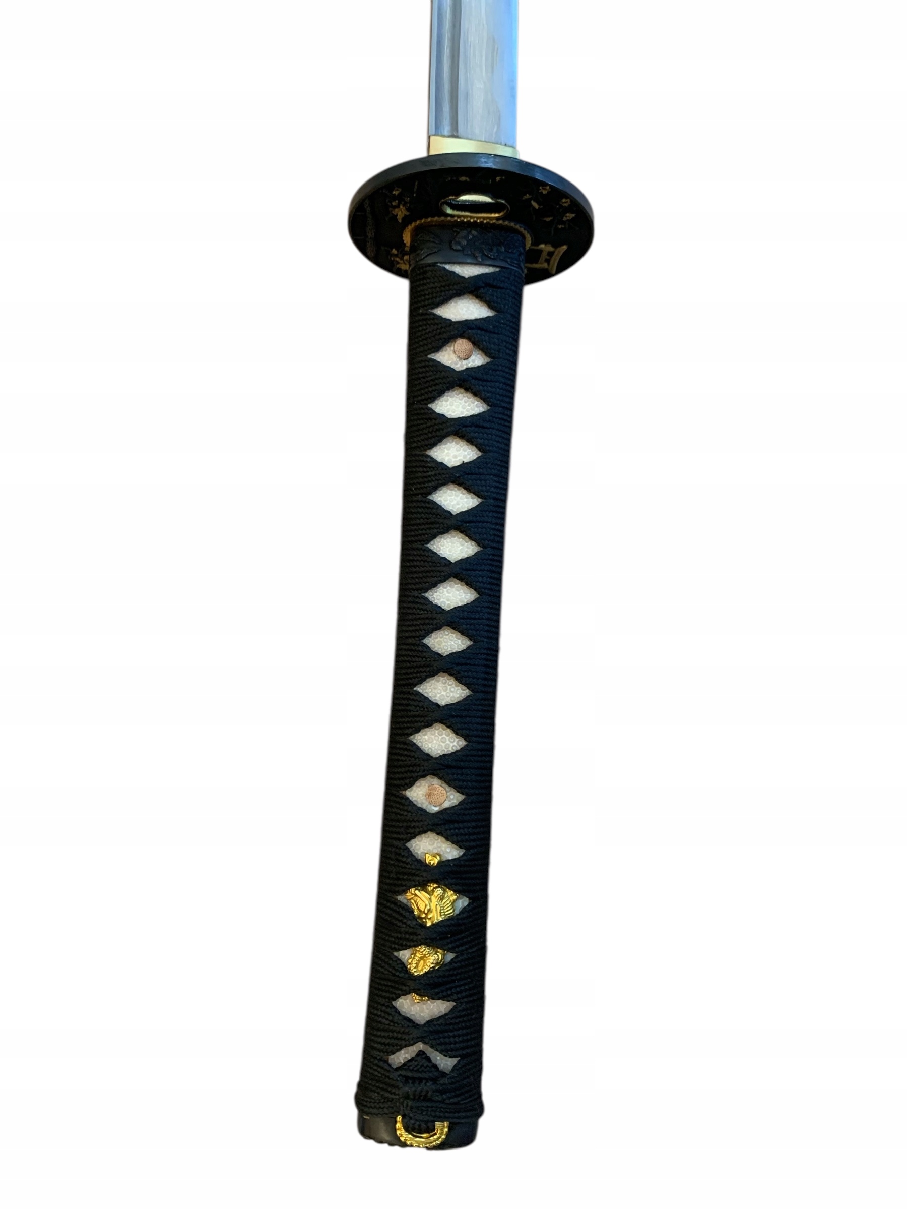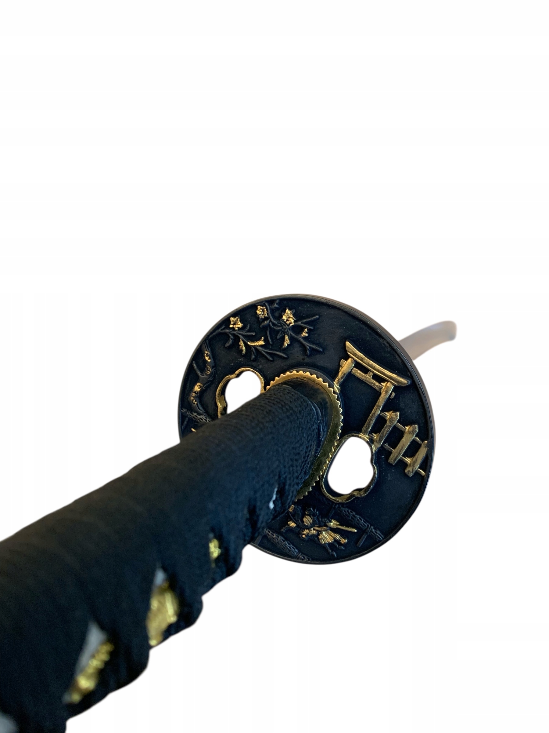 Декоративная металлическая перекладина в виде щита (Цуба) украшена японскими мотивами и имеет античную отделку.