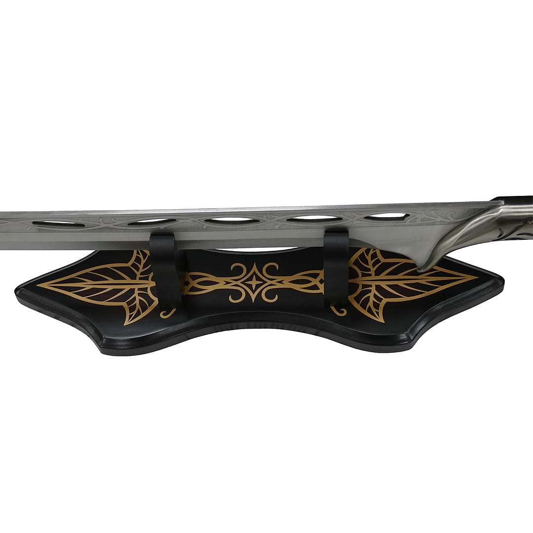 - Меч изготовлен из нержавеющей стали 440. На клинке имеется декоративная эльфийская роспись. и дырки. Ручка также выполнена из металла теплого серебристого цвета, украшена эльфийскими мотивами. В комплект входит подставка, позволяющая разместить его или повесить на стену.