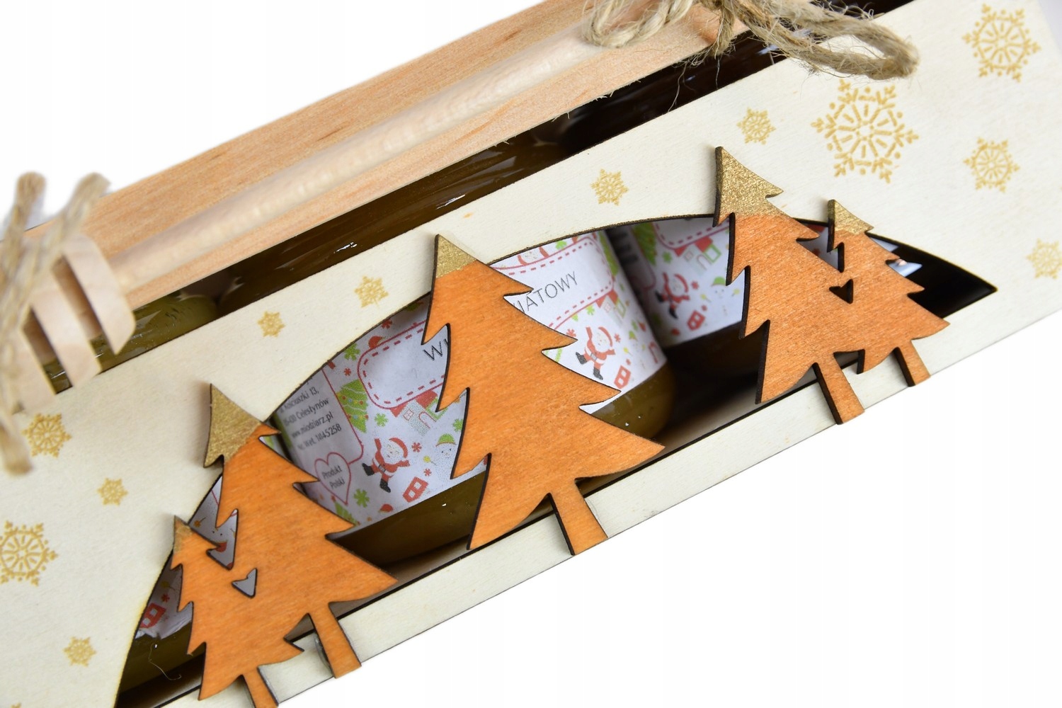 Элегантный набор из трех натуральных медов по 220г с нашей пасеки, заключенных в красивую деревянную коробку с елочными украшениями.