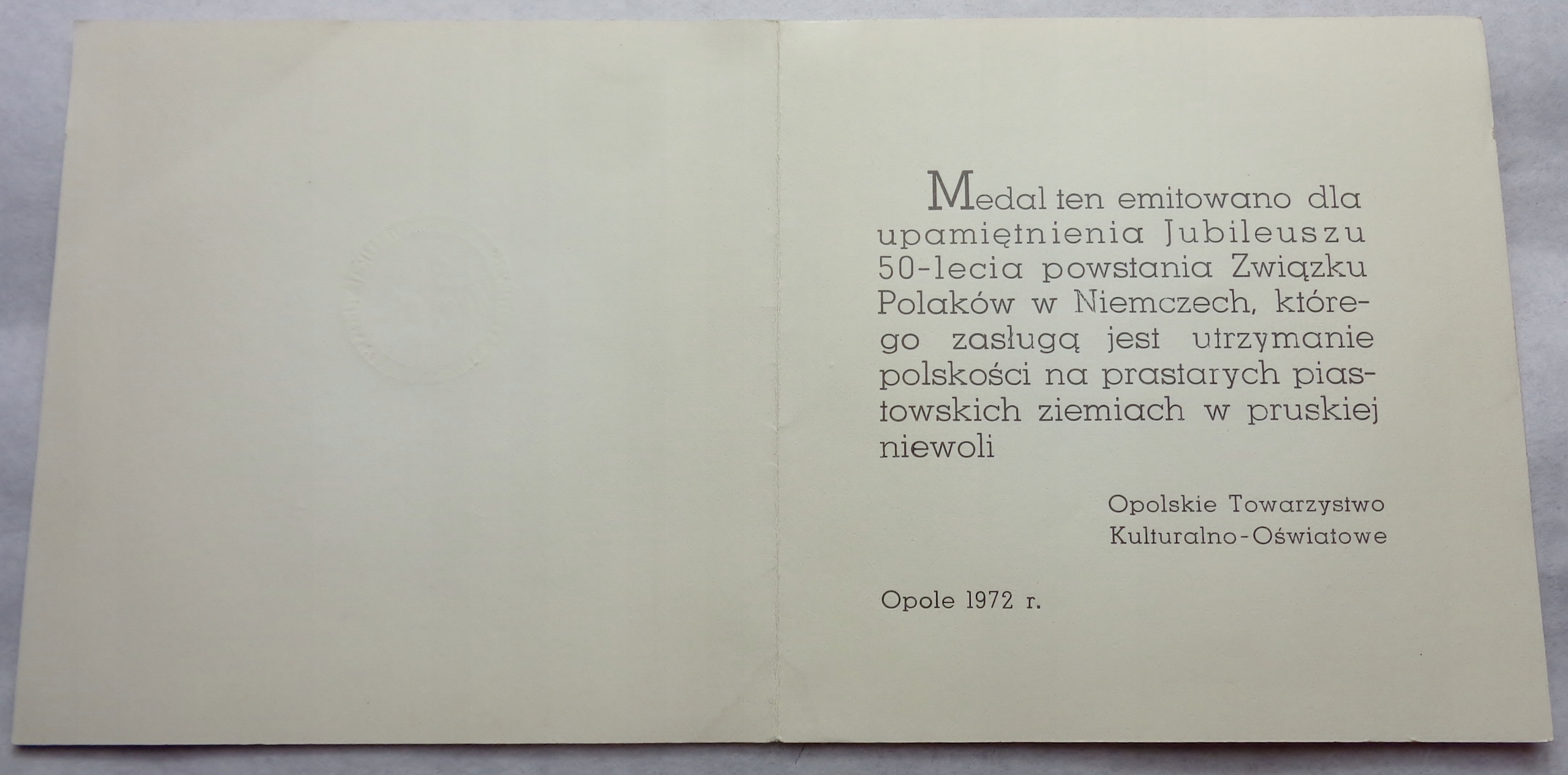 медаль - 50-річчя заснування Товариства поляків у Німеччині 1922-1972 рр.