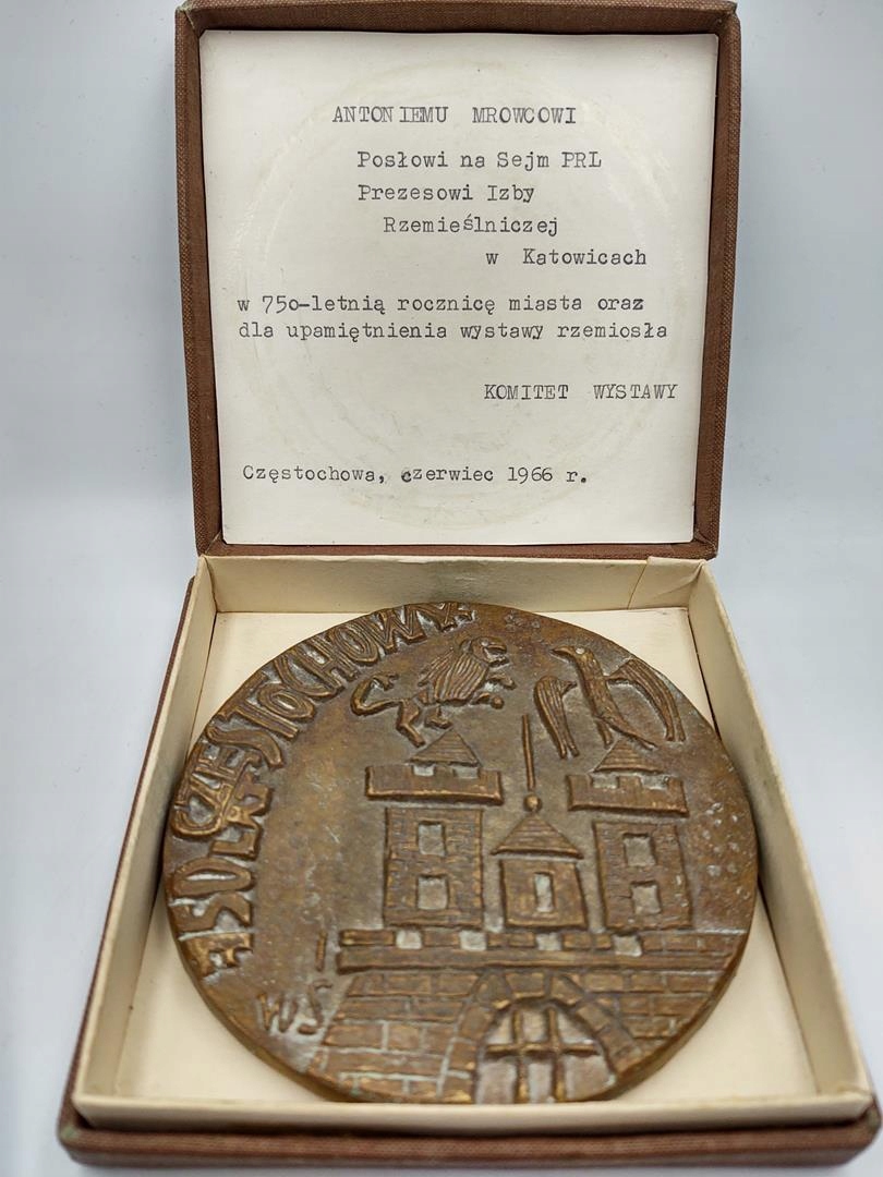 Медаль по случаю 750-летия Ченстоховы и юбилейной выставки Ченстоховских ремесел в 1966 году. Медаль вручена Антонию Мровцу - Депутату Сейма Польской Народной Республики и Президенту Ремесленной Палаты в Катовице.