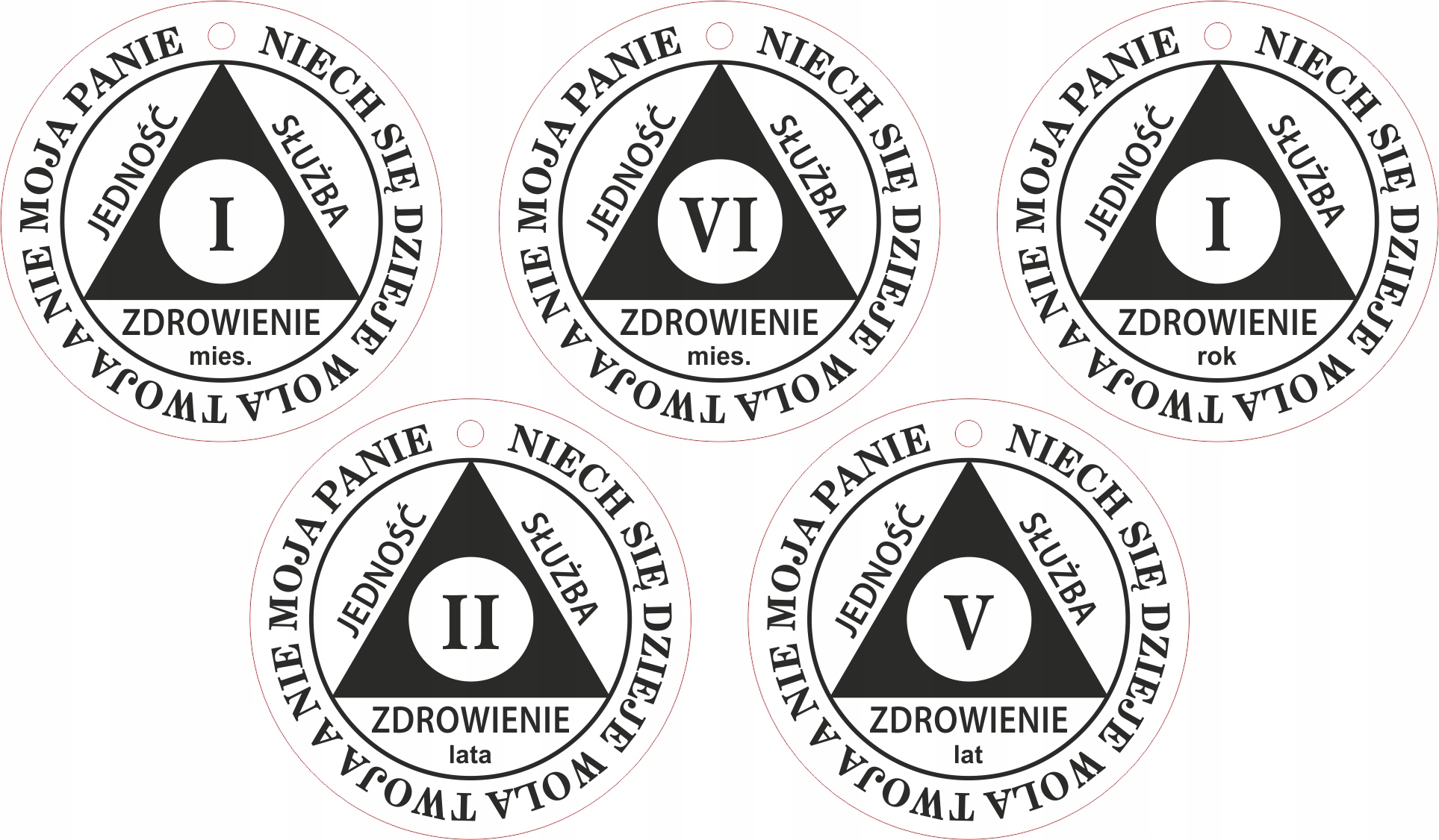 На аверсе изображен треугольник сообщества анонимных алкоголиков с тремя легатами, т.е. ЕДИНСТВО, СЛУЖЕНИЕ, ИСЦЕЛЕНИЕ и цифра в середине, означающая число месяцев или лет воздержания. Вокруг него надпись: Да будет воля Твоя, а не Моя, Господи.