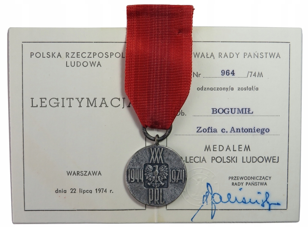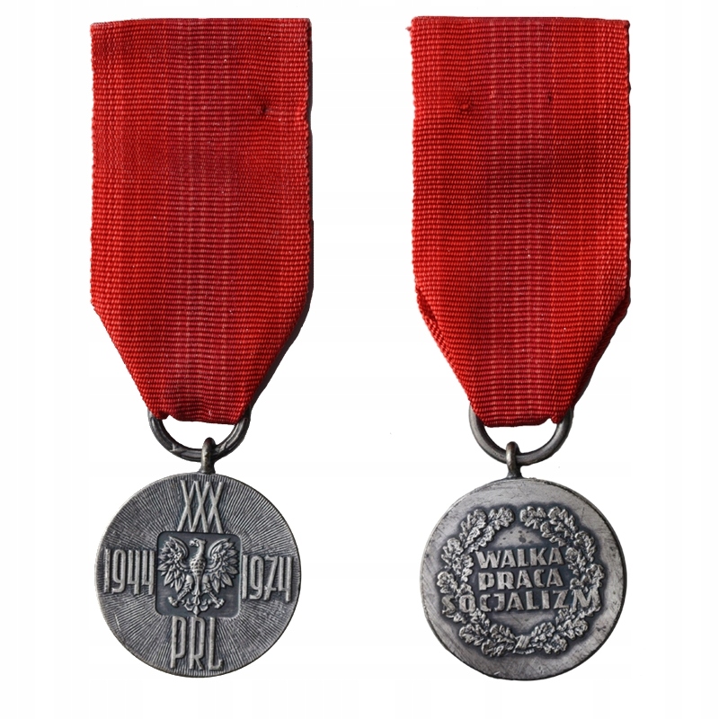 Медаль 30-летия Польской Народной Республики вручена постановлением Государственного Совета Польской Народной Республики 1974 года, в комплекте с оригинальной именной карточкой и бордовым футляром с рельефным гербом. Награда вручена за заслуги в укреплении социалистического строя и развитии государства. Аверс: Государственный орел Польской Народной Республики в центре на прямоугольном поле. Надпись «ХХХ» вверху, по бокам даты 1944 и 1974 гг., внизу надпись «ПРЛ». Фоном является радиальное деление. Реверс: Надпись: «БОРЬБА С ТРУДОВЫМ СОЦИАЛИЗМОМ» в окружении дуба и лаврового листа. Лента: сплошная красная, прикреплена к металлическому кольцу. Удостоверение личности: Личное, датированное 22 июля 1974 года и подписанное Председателем Государственного Совета. Футляр: Оригинальный пластиковый футляр красного цвета с тиснением орла. Внутренняя часть отделана мягким материалом. Набор полностью оригинальный, полный и документирует важный этап истории Польской Народной Республики.