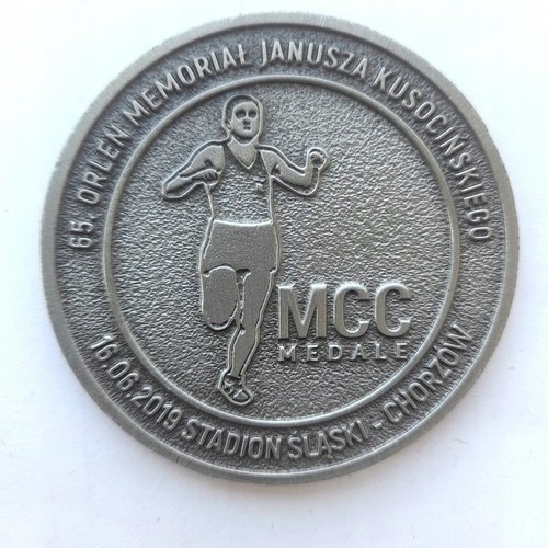 Описание: Официальная памятная медаль, выпущенная Польской ассоциацией легкой атлетики в 2019 году по случаю 65-го выпуска Мемориал Януша Кусочинского - соревнования состоялись 16 июня 2019 года в Хожуве на Силезском стадионе. На аверсе медали изображение известного польского спортсмена и название соревнования. На реверсе имеется знак и надписи PZLA.