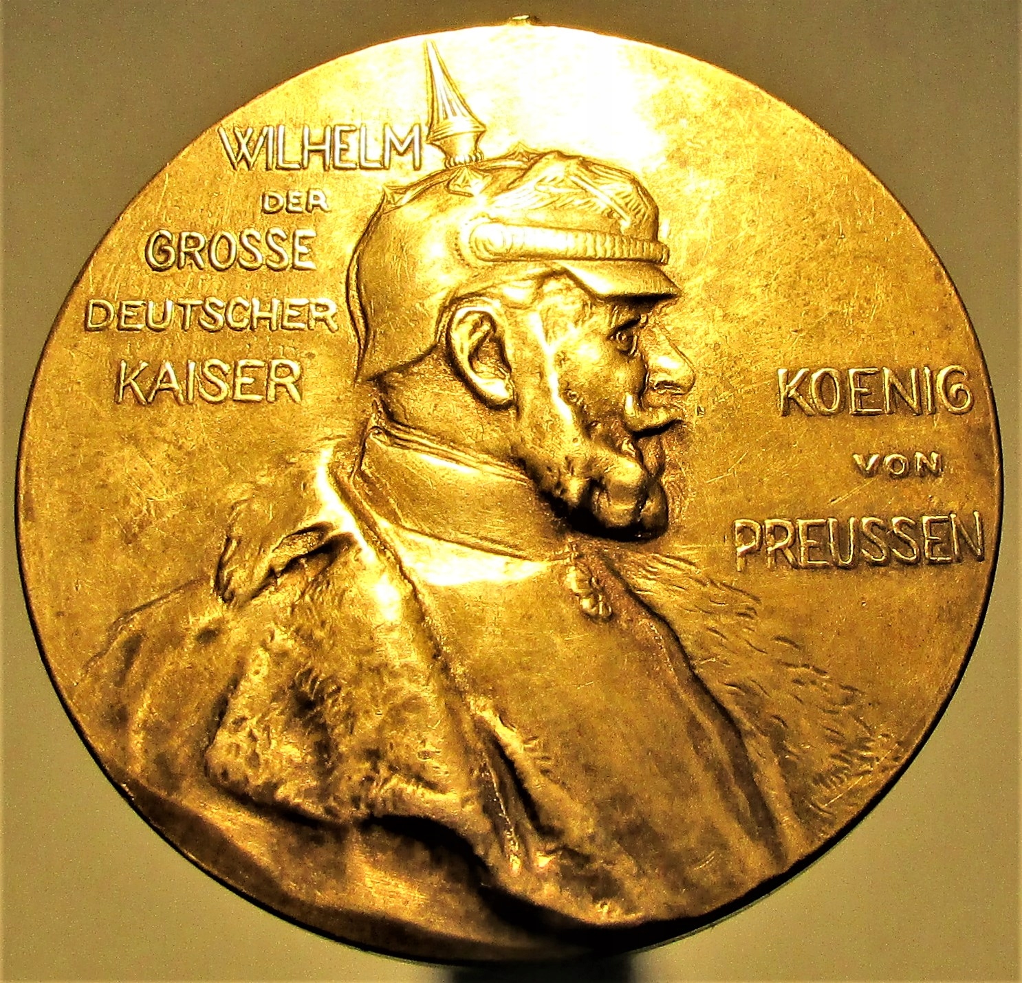 - На аверсе медали - бюст императора в военной форме и пикельхаубе на голове, окруженный надписью: WILHELM DER GROSSE DEUTSCHER KAISER KOENIG VON PREUSSEN.