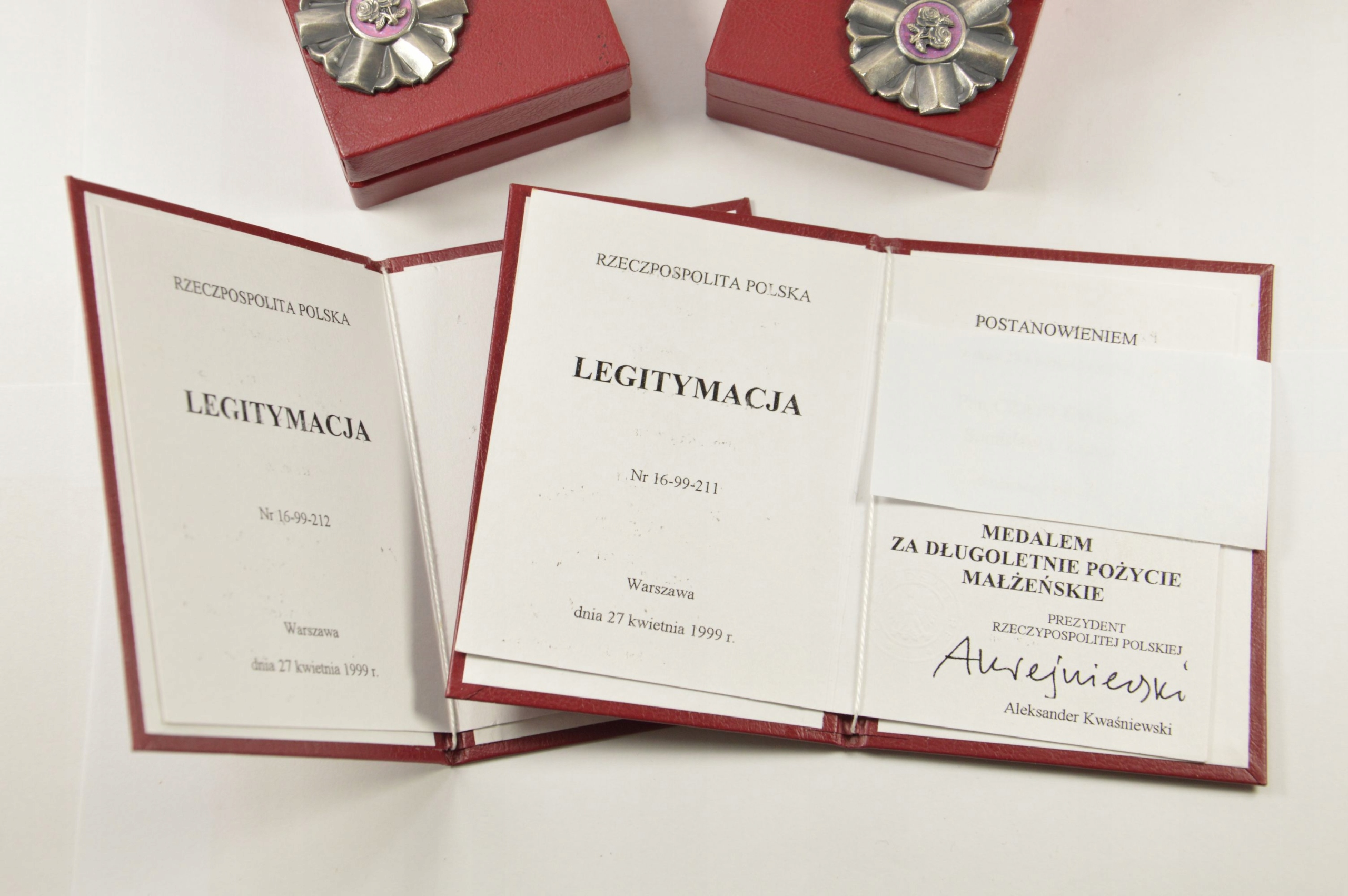 MEDALE ZA DŁUGOLETNIE POŻYCIE MAŁŻEŃSKIE LEGITYMACJA KOMPLET 1999 r.