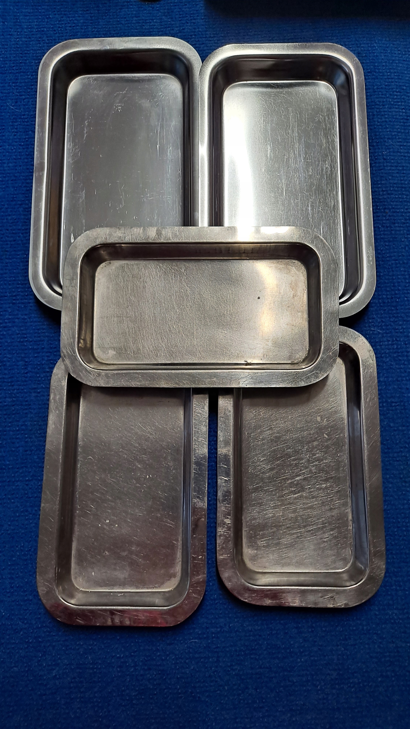 использовали медицинские лотки. 5 штук включали - два больших и три меньших. Размеры: большие лотки 26 см х 15 см (глубина 2 см), меньшие 22 см х 13 см лотков (глубина 1,5 см). Признаки использования видны.