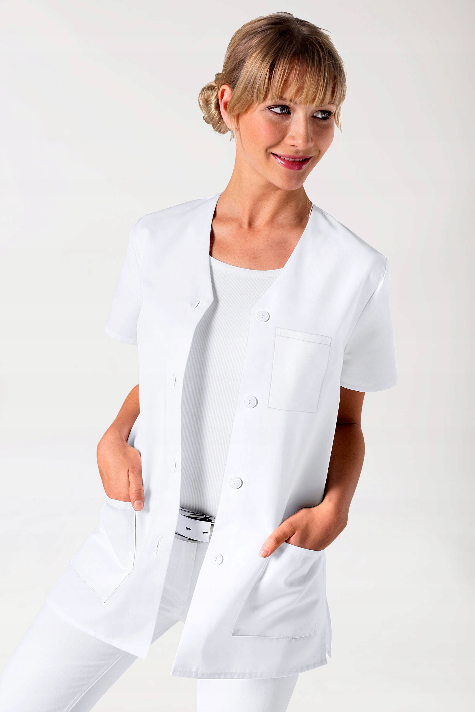 Эта женская туника подойдет как для больницы, так и для кабинета врача. Его вневременной дизайн умело подчеркнут V-образным вырезом. В двух практичных боковых карманах достаточно места для мелких предметов, необходимых для повседневной работы. Два боковых разреза и рукава полудлины обеспечивают комфорт и свободу движений в течение всего рабочего дня. Пуговицы позволяют легко застегивать эту тунику. Туника длиной около 75 см изготовлена из легкой в уходе смеси материалов (65 % полиэстер, 35 % хлопок). Ее можно стирать в стиральной машине при температуре 95°C.