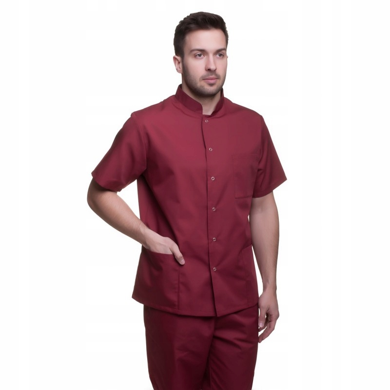 С низким воротником-стойкой, короткими рукавами, двумя карманами на уровне бедер и карманом на левой груди (рекомендуем разместить здесь логотип компании или персонификацию из флока – для этого обращайтесь к производителю).