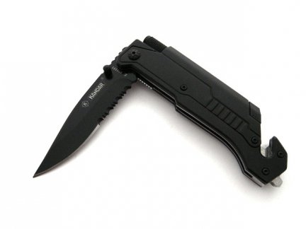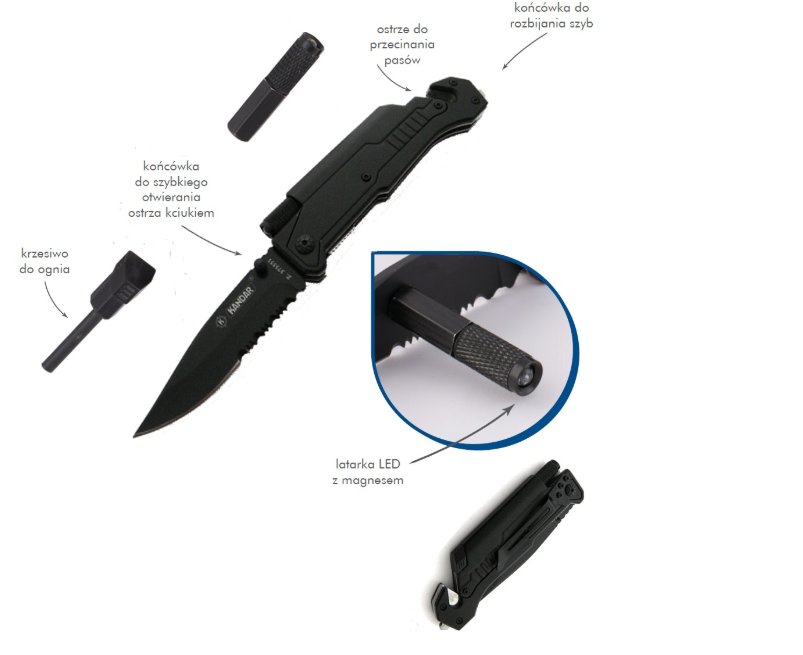 Нож жизни. Ножка ручки оснащена так называемым нож жизни, т.е. стеклобой и короткое защищенное от травм лезвие (без наконечника), предназначенное для быстрого перерезания веревок, ремней (например, ремней безопасности), одежды и т.п. Лезвие (резак) используем, подцепив разрезанную веревку ( ремень и т. д.), чтобы зацепить выемку на конце лезвия в рукоятке и сильно потянуть ее, чтобы разрезать ее. Используем прерыватель, ударив сильным и решительным движением по стеклу. Помните: оба элемента ножа жизни мы используем только в экстренных ситуациях!