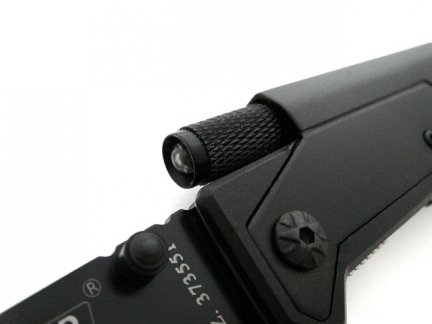 Фонарик. Съемный водонепроницаемый фонарик расположен в так называемом задняя часть ручки. Отражатель направлен вдоль обуховой части лопасти. Фонарик имеет магнит в ножке, что позволяет прикреплять его к металлическим предметам (например, лезвию ножа) во время работы. Благодаря этому вы сможете точно светить в нужном направлении, не отрывая рук. Фонарик включается плавным поворотом верхней части по часовой стрелке примерно на пол-оборота.Для надежного крепления фонаря к ножу можно (хотя и не рекомендуется), сняв фонарь с зажима, повернуть шестигранную ножку на 1 /12 оборота и плотно вдавите фонарик обратно в зажим. Фонарик тогда будет очень сложно снять. Фонарик оснащен 4 батарейками LR 621.