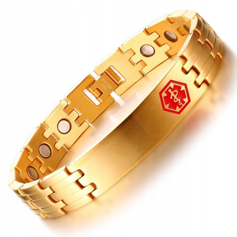 Элегантный, стильный магнитный браслет с красным медицинским значком, с возможностью персонализации на пластине, изготовленный из стали 316L, также известной как благородная сталь, нержавеющая сталь, или хирургический, покрытый золотом, с прочным IP-методом. Продукт высочайшего качестваи. Идеально отполированные стальные элементы обладают антиаллергенными свойствами, долго сохраняют блеск, не требуют чистки, не чернеют и не тускнеют.