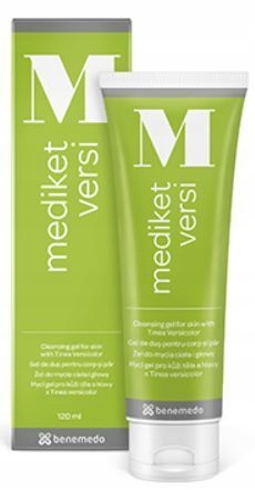 Mediket Versi, гель для мытья тела и головы, без отдушек, предназначен для взрослых и детей от 10 лет. Содержащийся октопирокс обладает противогрибковыми свойствами и удаляет с кожи дрожжевой грибок Malassezia, который является непосредственной причиной разноцветного лишая. Яркий ихтиол, помимо своей противогрибковой и антибактериальной активности, также уменьшает себорею и успокаивает раздражения кожи.
