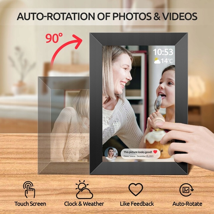 Фоторамка будет отлично смотреться на вашем столе, комоде и вашем домашнем шкафу. Важно, что две установки - висячие и лежащие на уровне доступны в любом месте. При вращении рамы автоматическое управление позволяет обрезать фотографии, чтобы люди находились в центре рамы.