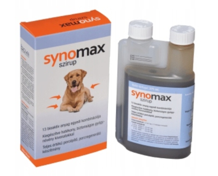 Действие: Препарат поддерживает подвижность суставов и гибкость хрящей. Он защищает и регенерирует хрящ, уменьшает отек и воспаление, облегчает боль в суставах. Применение: - у пожилых собак, страдающих заболеваниями суставов, - в качестве дополнения к лечению после операций, повреждений и воспалений, - у собак с избыточным весом, у рабочих и гоночных собак. Состав: Глюкозамина сульфат 2,5 мл – 375 мг, 5 мл – 750 мг; Хондроитина сульфат 2,5 мл – 125 мг, 5 мл – 250 мг; Метилсульфонилметан (МСМ) 2,5 мл – 125 мг, 5 мл – 250 мг; Желатин гидролизат (свиной) 2,5 мл – 25 мг, 5 мл – 50 мг; рыбий жир Омега-3 2,5 мл – 2,5 мг, 5 мл – 5 мг; Гиалуроновая кислота 2,5 мл – 1,25 мг, 5 мл – 2,5 мг. Гарпагофитум распростертый 2,5 мл – 100 мг, 5 мл – 200 мг; Босвелия пильчатая 2,5 мл – 10 мг, 5 мл – 20 мг; Бромелайн 2,5 мл – 10 мг, 5 мл – 20 мг; Сульфат марганца (Е5) 2,5 мл – 2,5 мг, 5 мл – 5 мг; Витамин А (Е 672) 2,5 мл – 250 МЕ, 5 мл – 500 МЕ; Витамин С (Е 300) 2,5 мл – 25 мг, 5 мл – 50 мг; Витамин Е (Е 700) 2,5 мл – 2,5 МЕ, 5 мл – 5 МЕ. Действие ингредиентов Synomax: Сульфат глюкозамина поддерживает процесс регенерации хряща и улучшает вязкость синовиальной жидкости. Хондроитинсульфат восстанавливает эластичность суставного хряща, останавливает процесс его разрушения и одновременно оказывает противовоспалительное действие. МСМ (метилсульфонилметан) – обычно считается анальгетиком при воспалении суставов. Harpagophytum procumbens (коготь дьявола) оказывает защитное действие, ингибируя активность ферментов, предотвращая тем самым возникновение воспаления суставов. Босвеллиевые кислоты (экстракт Boswellia Serrata) обладают сильными противовоспалительными и обезболивающими свойствами. Они защищают и увеличивают кровоток в суставах. Бромелайн является противовоспалительным фактором, который поддерживает регенерацию тканей. Гиалуроновая кислота способствует поддержанию оптимального уровня подвижности суставов. Гидролизат желатина содержит 18 свободных аминокислот, необходимых для построения коллагена, который является основным компонентом суставного хряща. Соотношение и состав аминокислот соответствует составу и соотношению аминокислот, образующих коллаген. Рыбий жир (жирные кислоты Олег-3) снижает выработку цитокинов - медиаторов воспаления.