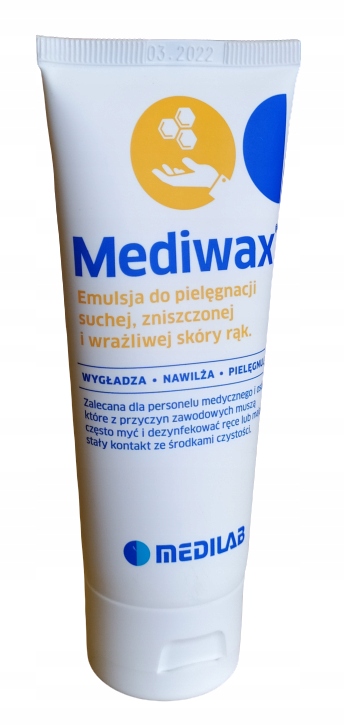Эмульсия для ухода за кожей Mediwax от Medilab создана на основе пчелиного воска. Рекомендуется для использования на чувствительной, склонной к раздражению и сухой коже. Благодаря разработанной рецептуре препарат не оставляет ощущения липкости, обеспечивая кожу необходимыми питательными веществами. Имеет нейтральный pH. Упаковка объемом 0,5 л адаптирована к типичным ручным дозаторам (Ingoman, Lydos). Продукт создан для сотрудников, которые по профессиональным причинам часто моют или дезинфицируют руки. Mediwax также стоит использовать при частом контакте с чистящими средствами.