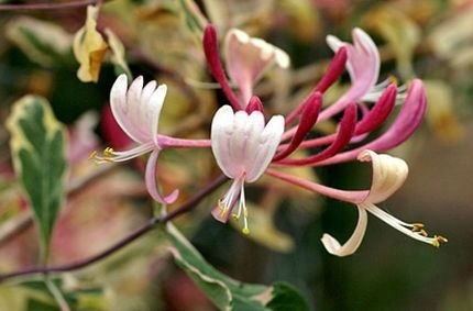Ценная лиана с невероятно декоративными бело-кремовыми листьями. Листья меняют цвет с различной интенсивностью, часто розовея в холодные дни. Розовые цветки появляются поздней весной и сохраняются на кусте до конца лета. Цветы источают красивый, интенсивный аромат. Жимолость «Арлекин» любит солнечные и полутенистые места. К почве не требователен, но лучше растет в слабокислой почве. Любит много воды. Он вырастает примерно до 4-6 м с годовым приростом ок. 0,5 – 1 м в год. Растение прекрасно лазит по различным типам сеток, беседкам и перголам.