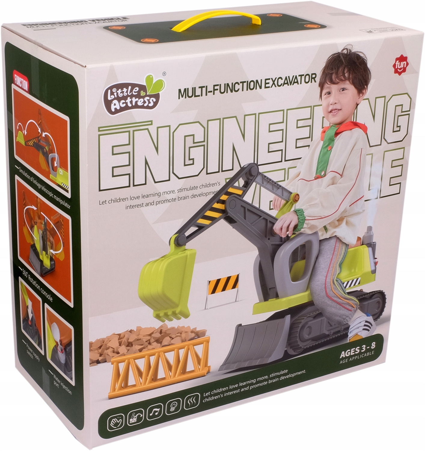 Стрела экскаватора удобна в использовании благодаря удобной ручке.Платформа с стрелой может вращаться на 360°. Каждое движение экскаватора происходит с небольшим сопротивлением и щелкающим звуком, что создает впечатление контакта с настоящим мощным экскаватором!