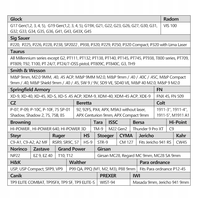 Этот светильник Mega-Fit Light широко совместим с более чем 150 популярными полноразмерными или компактными полуавтоматическими пистолетами с Streamlight TLR. -1 или TLR-2, таких как Glock, Beretta, Browning и т. д. Также подходит для пистолетов со сменными коллиматорными прицелами и высокой мушкой. Пять передних винтов позволяют легко и быстро отрегулировать пространство кобуры для совместимости с сотнями полноразмерных пистолетов. Для регулировки используется шестигранный ключ.