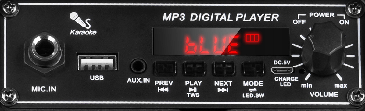 Колонка с действительно солидной мощностью оснащена стандартным музыкальным проигрывателем из таких источников, как Bluetooth - для воспроизведения музыки с телефона, разъемом USB, входом AUX и микрофоном.