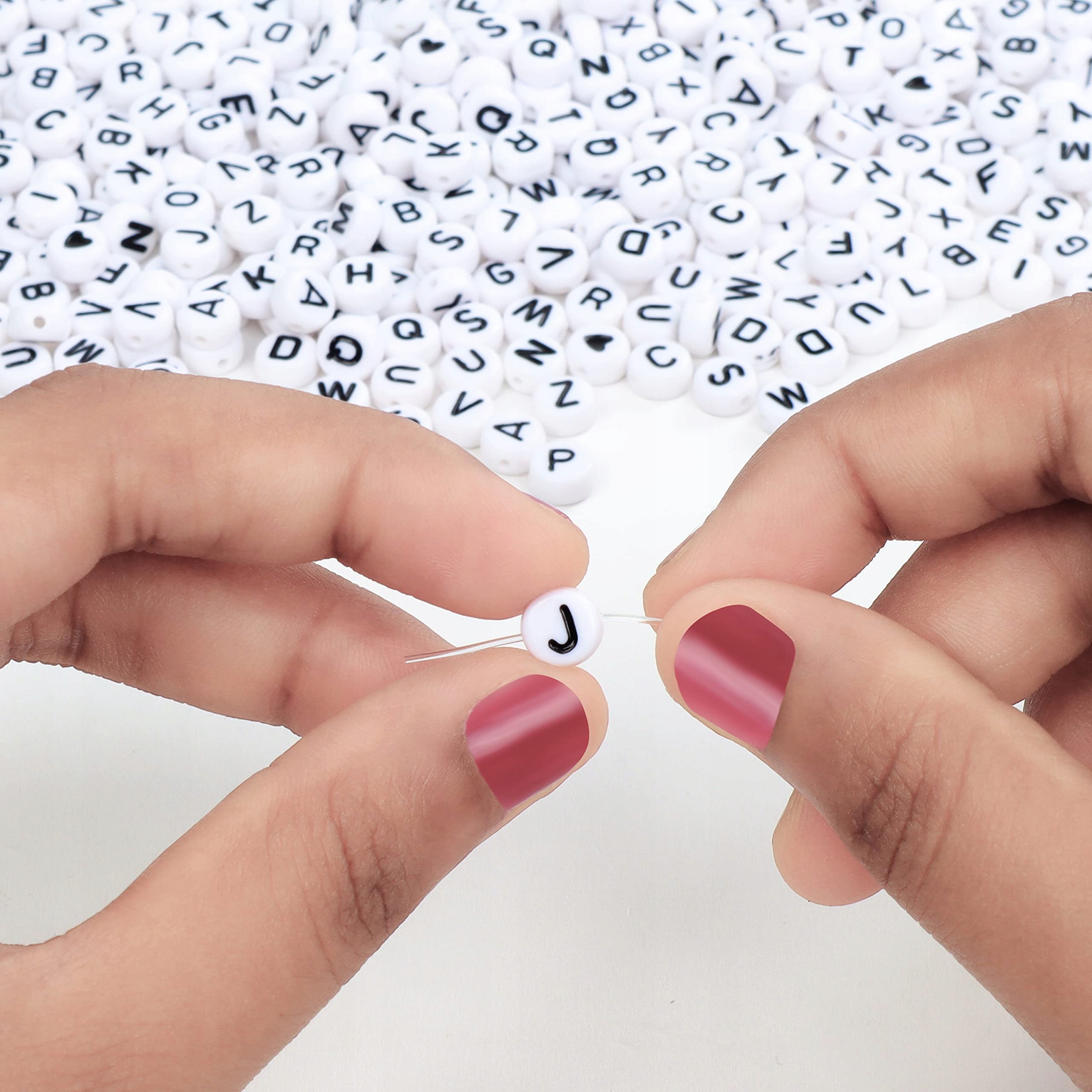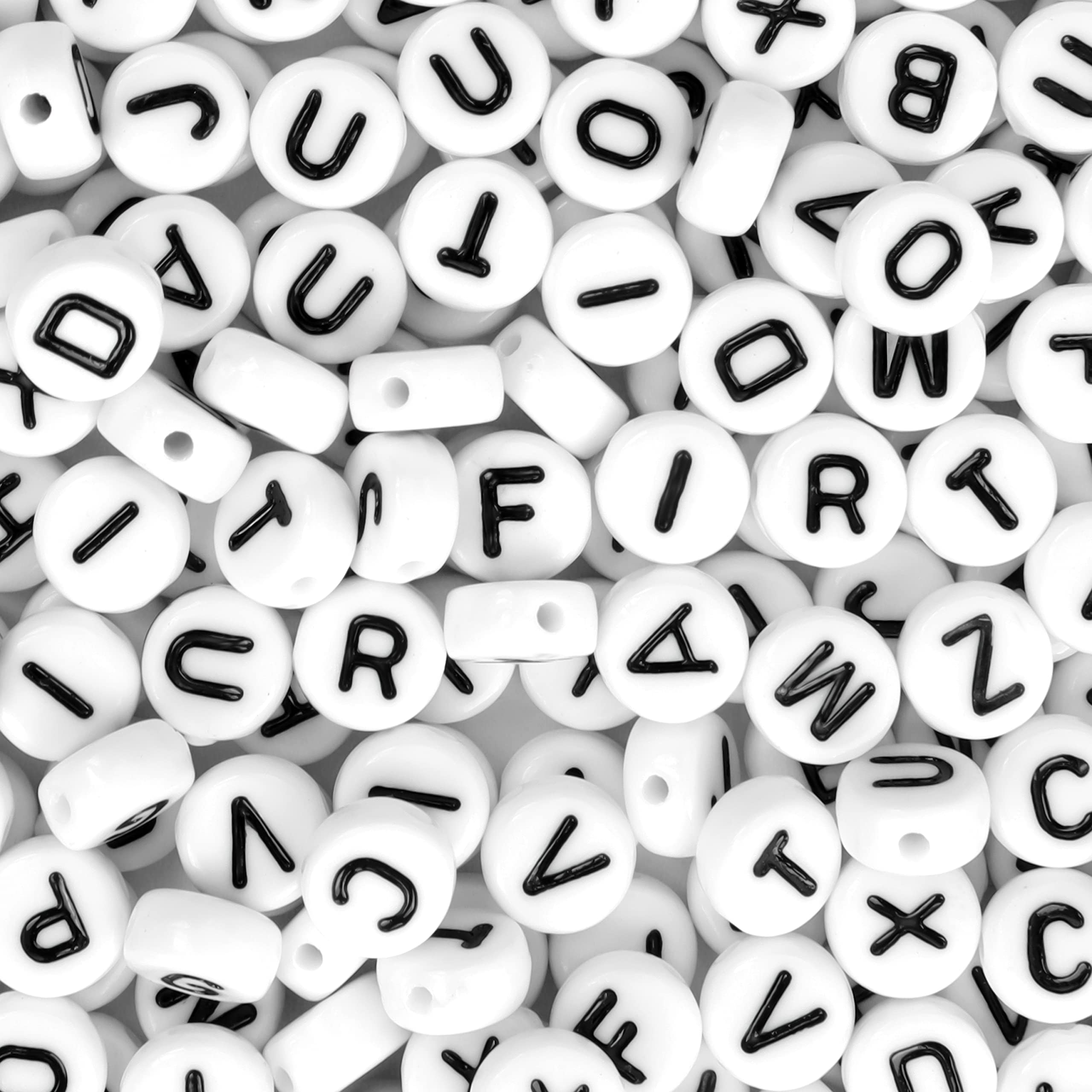 Размер бус: диаметр - 7 мм, толщина - 4 мм; Цвет: бусины - белые, буквы - черные.
