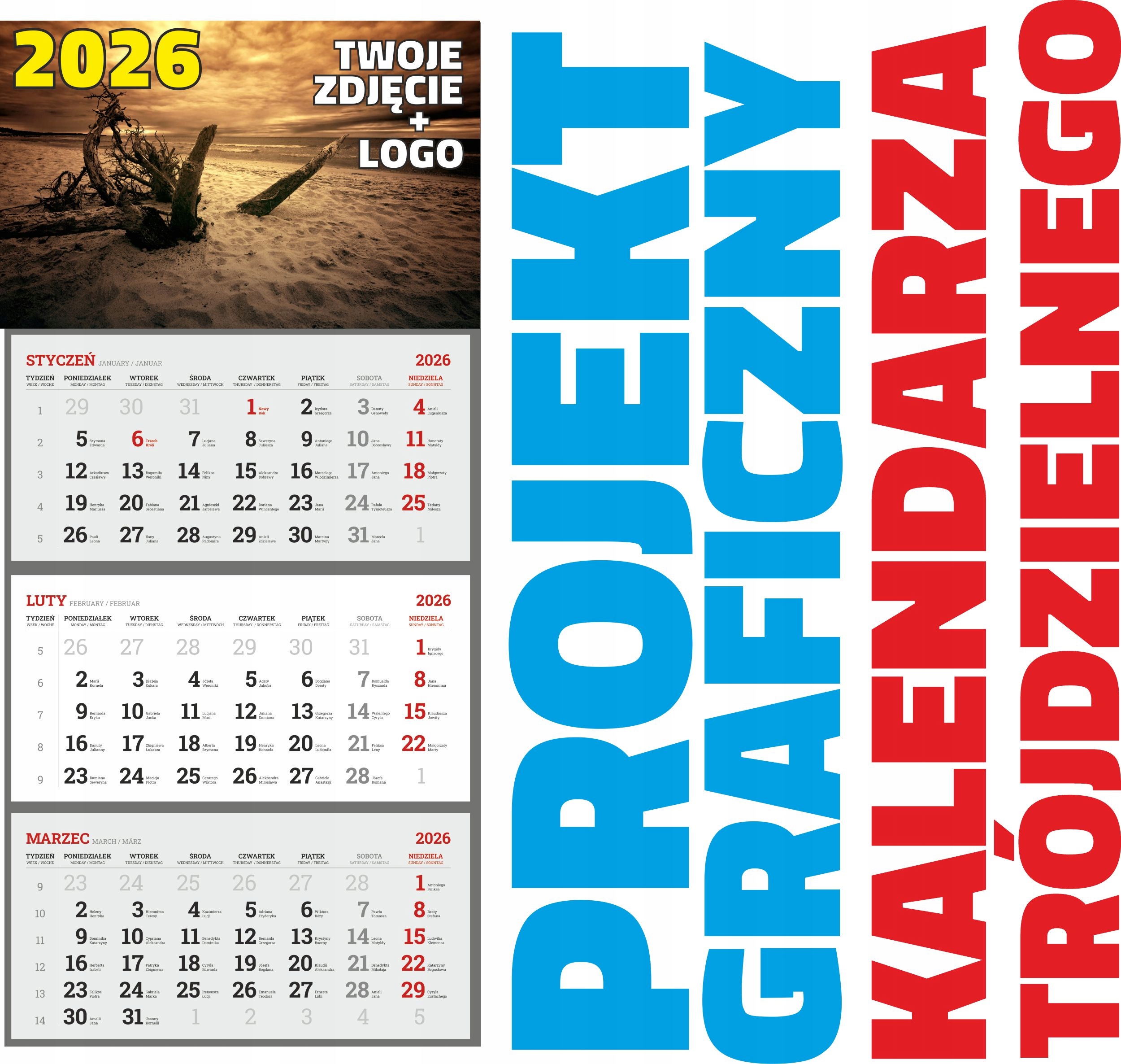 календарь на трех языках ( польский , английский, немецкий), с отмеченными числами и отмеченными именами.